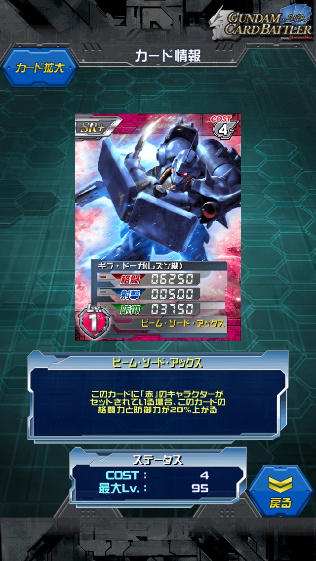 ギラ・ドーガ(レズン機) 犬鴨さんからの提供カード 当ブログはGCBの迷える子羊とガンダムに詳しくない方の味方です(笑) 逆シャアイベントでのACEドロップ、をエボしたものですね 別名:青ドーガ MAX値は9000/500/5500 赤キャラセットで10800/500/6600です コスト4という軽いこともありながら 赤ではクロスボーンが出るまで格闘不足だったためかなり重宝されたカード スキルも専用キャラでないことは大きなポイント 別に射撃にも防御にも期待はしていないので 格闘得意なキャラ、又は軽めのキャラを乗せて使いたいところ コストに余裕が出てきたらX3等に置き換えていきたいですね 専用パイロットはレズンです。 その名の通りレズン専用のギラドーガ 青色なのが特徴、別に近接が得意な記憶もない 逆シャアで数少ない名前つきパイロット、その最後は中々珍しく 戦艦ラーカイラムの機銃で落ちるというもの その時機銃を使っていたのはチェーン。 チェーンがその時持っていたサイコフレームが淡く発光しており チェーン自身も不思議な感覚を感じて撃墜したことから その時点で何らかの力が働いたのではないかと まぁ…やられ役でしたね(;´Д`) [0回]