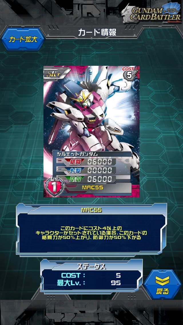 シルエットガンダム 犬鴨さんからの提供カード 赤スキーな方ですかね?私も赤スキーです(*´▽`*) プレミアムガシャ・・・だったかな どこかの国のようにF91をパクった機体です MAX値は8800/0/8800 コスト4以上のキャラセットで13200/0/4400とかなりの格闘特化 専用パイロットはトキオとレイラ コスト5でこの格闘値はかなり優秀な数値 防御が下がる?知ったこっちゃねぇ! …と言いたいところですけど 元の格闘値は8800なのでそこまで高くないためオートではスルーされて ド平均ユニットに出番を奪われたり 逆に防御の8800が仇となり防御に出てしまったりとリスクはあります。 コスト4以上のキャラを乗せなければならないため 専用パイロットを除くとなるべく防御が低いキャラを乗せて 少しでも防御に出る場面を無くしたいのでギュネイとかでもいいかも 知る人ぞ知るシルエットガンダム 漫画…みたいですが私はGジェネでしか知りません^^; アナハイム・エレクトロニクス社は1年戦争から栄えたMS開発会社でしたが F91の時代には廃れてしまいサナリィに地位を奪われてそうになっています。 そのためサナリィが開発したF91のデータを参考に作成した アナハイム製のガンダム 活躍…とかは知らないのですがこちらも時代に合わせた小型化された機体 サナリィが訴えたら負ける、かもしれませんね [1回]PR