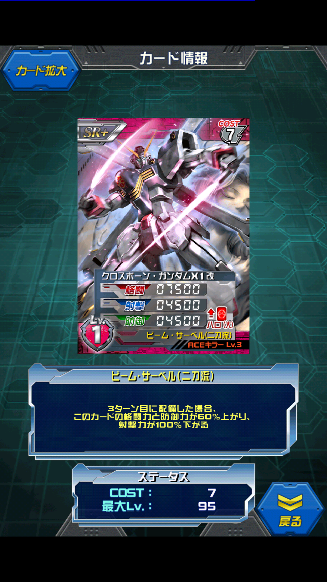 クロスボーン・ガンダムX1改 クロスボーンイベントポイント1000P交換商品です。 MAX値は10500/6500/6500 二刀流キュベレイ同様に3ターン目に本領発揮する機体 その3ターン目は16800/0/10400 キンケドゥとの相性はバッチリです。 SRキンケドゥを乗せたときはスキル発動で23050/0/15900と驚きの格闘値 キュベレイとの違いは射撃値が低めなので オートで射撃の枠に出にくいことが利点です。 キャラがいなくても発動できたり利点はあるのですが 1,2ターン目ではちょっと。。。 み、見た目はカッコいいですョ [1回]PR