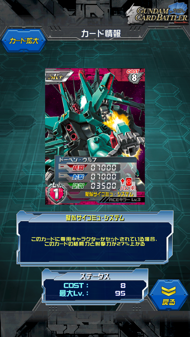 ドーベン・ウルフ サイコガンダムMk-2(赤)+ジャムル・フィンの開発ユニット 疑似サイコミュのインコムとメガランチャーが特徴の機体です MAX値は10000/10000/5000 専用キャラのラカンがセットされれば12700/12700/5000です。 上昇数値はどんなラカンでも2700固定ですが X1&X2はパイロットの120%上昇するところに差があります。 ぶっちゃけトビアをX1&X2に乗せると3000上昇するので トビアとX1&X2を持っているのなら無理して ラカンとサイコ2を探す必要はないかも インパクトがある機体ですが量産機です。 サイコMk-2の小型化を目指して作られた機体なので かなりの高出力機となっています。 格闘のイメージは全くありません。 最終決戦で投入された割にはゲーマルク、ザクⅢ改、フルアーマーZZと色々な機体と 交戦し戦果を挙げている名機です。 ただ残念ながら派生機はなく、第1次ネオジオン抗争で途絶えてしまったようです。 [0回]PR