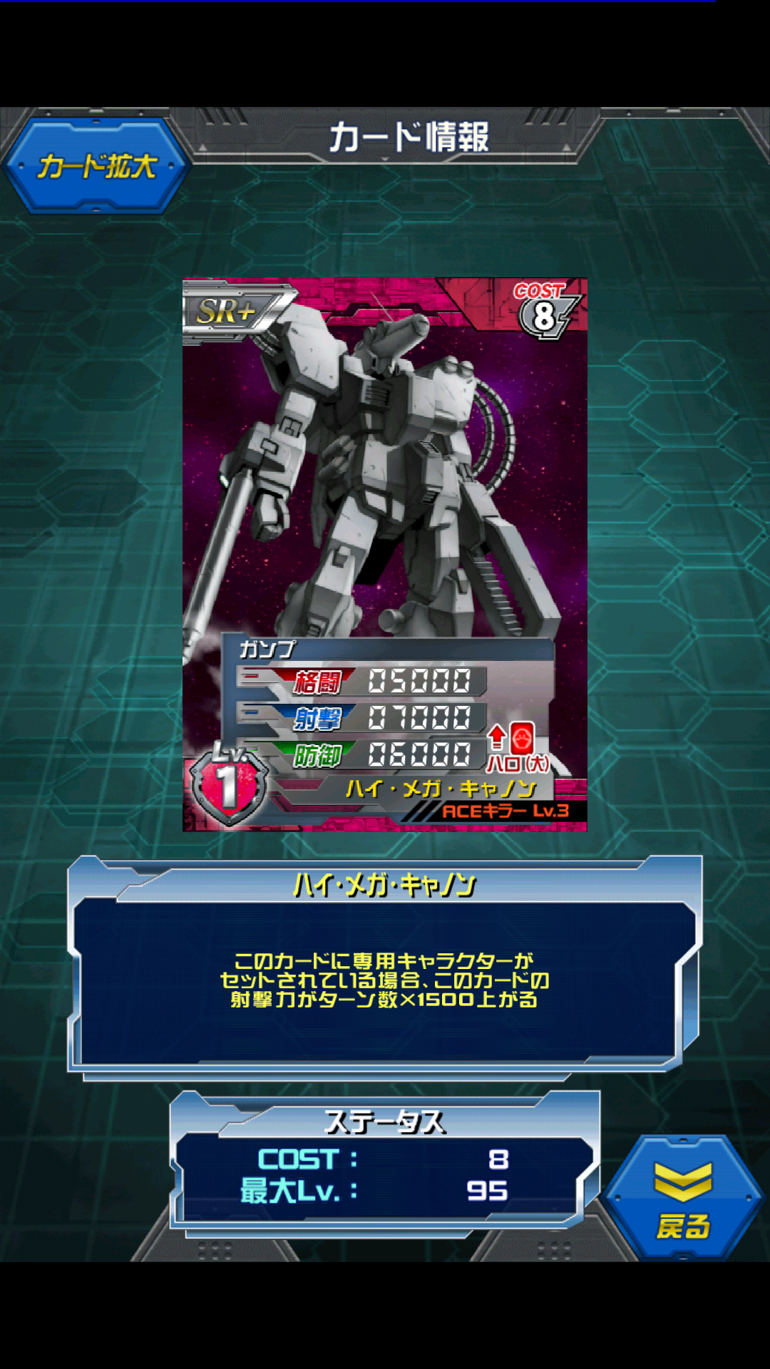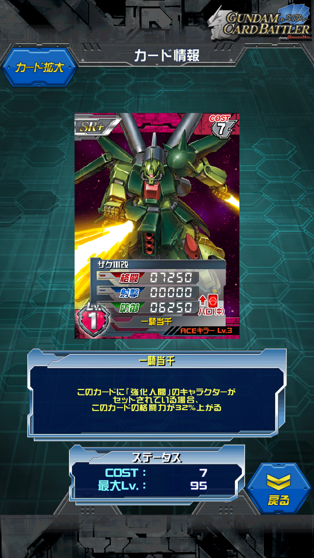 ザクⅢ改 ザクⅢ+リゲルグの開発ユニット 最強のザクと噂がある最期?のザクです MAX値は10500/0/9000 強化人間セットで32%アップという中途半端な上昇率により13860になります 少し前まで見れば赤格闘機キター!と喜ぶところなのですが 格闘だけならムラマサX3でもいいかもしれません。 元々赤デッキには防御という大きな穴があるので 赤単色はなかなか難しい色なのでこの防御9000も有難い値だったりします。 しかし…この機体そんなに格闘したかな…? 宇宙世紀最後のザク。今までのやられ役とは違い大活躍のザク。 ザク50?Reザク?それはまぁ置いておきましょうよ。 クインマンサに対し互角の戦いを見せたり ドーベンウルフに手足を防がれた中相撃ちに持ち込んだりと凄いザク。 サイコミュは積んでいないはずなのですが強化されたマシュマーの 謎のパワーで不思議な力を見せたりした。 機体性能をスペック以上に引き出したりする点を見ると ある意味マシュマーは最強の強化人間なのかもしれませんね [0回]