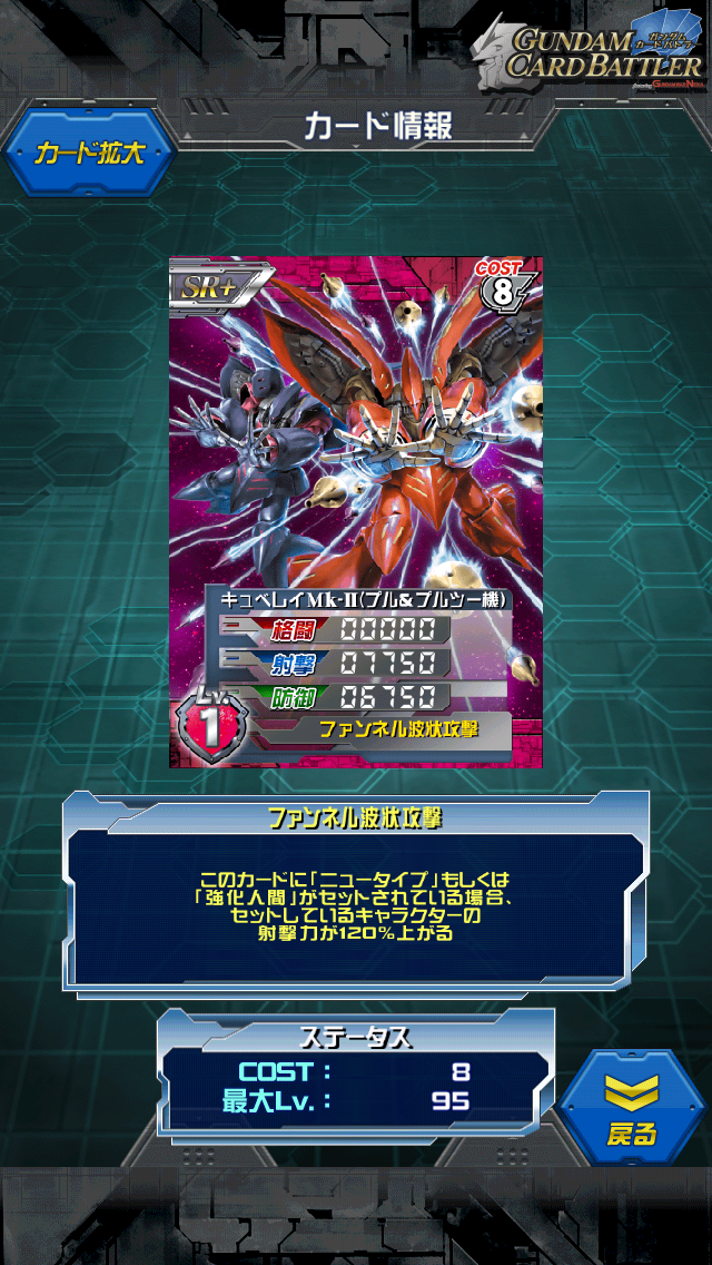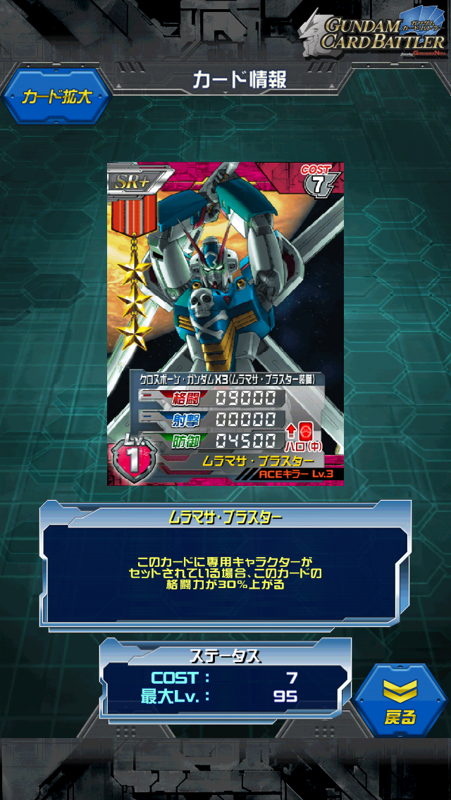クロスボーン・ガンダムX3(ムラマサブラスター装備) クロスボーンイベントポイント5000P達成報酬 今回のイベントの目玉である格闘不足の赤の救世主です。 MAX値は12500/0/6500 専用キャラのセットでスキルは発動するのでノーリスクなのは大きなメリット そして基本数値が高いのでトビアのスキルを存分に生かすことができます。 トビアを乗せれば 22250/3500/11300となり使いやすさ、格闘値共に文句なしです。 ちょっと絵柄はイマイチですが 現時点の赤では最強の格闘機かと思われます [0回]