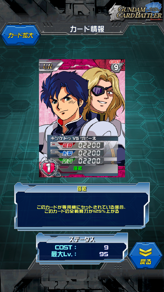 キンケドゥ VS ザビーネ クロスボーンイベント 碧い惑星に沈む ガシャ景品 クロスボーン・バンガードの2人のエースです。 MAX値はALL4000 専用機にセットすれば125%アップなので+5000のALL9000になります。 かの有名なURバナージの赤版。 あちらは課金ガシャ産のため高レートですがこちらは正直そこまでは… ただ使い勝手はこちらの方が上 ユニコーンしか乗れない彼とは違い X1、X2、X3と全てのクロスボーンに適正があり ついでにF91、ベルガギロスにも乗れます。 …最後のは要らないかな… キャラコスト9とかなり重いので複数積むことは無いかと思いますが +9000(専用機補正込みで+10000)という数値は魅力的なので なんとかコスト工夫して入れておきたいですね。 ちなみに裏切りの刃にセットするとALL29300 無条件でこの数値は他のURを寄せ付けません。 まぁコストも9/9取られるんですけどね F91のラストからクロスボーンの開始までに 何があったのか敵同士だった キンケドゥとザビーネが手を組んでいたクロスボーンバンガード。 ただベラが貴族主義を推奨しないため 貴族主義の考え方に近い木星帝国へ裏切ることに。 このイラストの2人の対決はザビーネが勝利し キンケドゥのX1は宇宙から地球へ落とされることに。 ここで瀕死のキンケドゥは人類初のビームシールドで大気圏突入を行う。 その後の勝負は…またどこかで(笑) [4回]