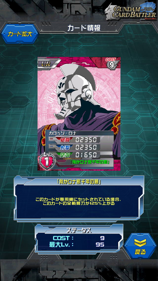 カロッゾ・ロナ 2周年記念イベント 課金ガシャ景品 F91のラスボス、ラフレシアのパイロットです。 MAX値は4250/4250/3000 専用機セットで9562/9562/6750 このイベントのためにLR、もしくはURユニットが欲しくて引いたんですが まさかURキャラが出るとは…(;´Д`) 専用機セットが条件ですが実質ラフレシアの一機。 今回のLRに乗せるために登場しているのですが 逆に言うとLRラフレシアが無いと乗せるものが無いという悲しいUR。 SR+ラフレシアも格闘射撃機なので乗せれない訳では無いですが まぁ無いですよね(笑) うーん もう一度ぐらい引いてみてもいいのですが さすがに15回も引くほど豊かな生活を送っている訳では無いので 結局トレ弾かなぁ。アムロシャアとか欲しいなぁ…(*´▽`*) 鉄仮面と呼ばれる正体はベラの父親。 普通の人間でしたが強化人間になったあとはコクピットハッチを素手でこじ開けたり 宇宙空間に出たりと無茶苦茶な存在。 人類の10分の9を滅ぼせと言われればこうもあろう、との理論で 人間だけを殺す兵器バグを使用する。 誰に言われたんだろう… 一度見たら忘れませんよね…このキャラ [3回]