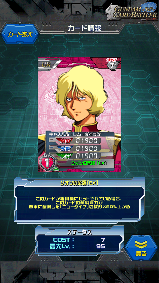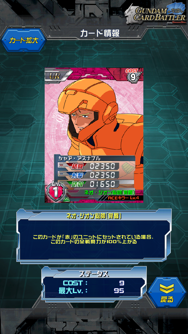 キャスバル・レム・ダイクン あれ?金曜からのイベント発表まだですかね シャアさん残り1日、期待してますよっ MAX値はALL3500 専用機セットで自軍のNTの数だけ強化される。 キャスバル自体NTなので専用機に乗せさえすればとりあえず強化されます。 1枚だとALL5600 2枚だとALL7700 3枚だとALL9800 3枚揃った数字を見ればかなり強力なキャラだと言う事が分かるはず。 オマケに名は違えどシャアなので専用機も豊富。 ただ注意点は「ニュータイプ」のみ、ということ。 強化人間は除外対象なのでお気を付けください。 私でも「アイツ、強化人間だっけ?」というキャラがいるので ガンダムをあまり知らない人は誰が何だか分からないんじゃ… NTデッキを組まないとなかなか発揮できない意味でも 扱いが難しいキャラですね シャアの本名。 知らない人はオリジン「青い瞳のキャスバル」を見に行こう! (もう終わっちゃいましたか) そういや見に行ってませんね。まぁ1年戦争前のシャアの過去話メインっぽかったので 映画館で見るまでも…という印象です。 オリジンアニメ化はてっきりTVで26×2話辺りで やってくれると思っていたのですが… どうでもいいですが強化人間ネタで 初期のGジェネではヒイロは強化人間扱いでした まぁ…ビルから落ちても無事だったり改造人間っぽいですが どちらかというとカトルにニュータイプをあげてください。 [1回]PR
