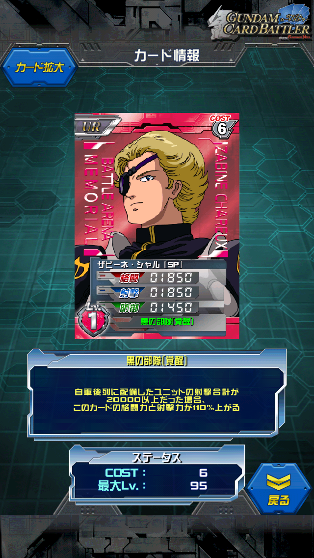 ザビーネ・シャル(SP) ポイント余ったので私のデッキに使えそうなザビーネさん取りました。 F91の彼は地味だったんですけどね MAX値は3400/3400/2650 自軍後列のユニットの射撃値が2万超えていれば 7140/7140/2650の変わり種スキル 極端な事を言えば後列にLR1枚いればほぼ達成できるスキル。 α同様にそこまで辛い条件では無いので気にする必要はないかと。 ユニットの射撃値、というのはスキル発動前の数値になるので 注意…するほどでも無いか(笑) 裏切りの刃にキンケザビを乗せるのが重いと感じているので取ってみた1枚。 裏切り+キンケザビならALL29300 裏切り+ザビなら26420/26420/20655 ステータス、安定感、防御と色々失いますが… キャラコスト9を割り当てる余裕が無くなってきた際の選択肢にどうぞ。 黒の戦隊を率いるクロスボーンバンガードのパイロット。 F91で登場している…が、そこまで印象は無かったり どちらかと言うと続編クロスボーンガンダムが本番。 F91~クロスボーンの間に何があったのか分かりませんが ベラ、シーブックと共に新生クロスボーンバンガードの一員になる。 ただ、ザビーネの目的は貴族主義を復活させることだったみたいですが… [1回]
