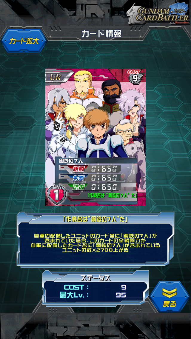 鋼鉄の7人 裏切りの女神ガシャ景品 2枚目のURキャラは全員集合カードです。 MAX値は3000/3000/3000 ステータス自体はコスト7のよくある数値ですが 注目はそのスキル 自軍の「鋼鉄の7人」のユニットの数×2700上昇するため 最大値はなんと11100/11100/11100 ヘタなユニットよりも強くなります。 ただその代償としては鋼鉄の7人のカードを複数枚入れる必要があること 場に1枚だとALL5700とコスト9の割に合いません 2枚出て8400なので最低場に2枚ある状況を作っておきたいところ 専用機はお察しの通り色々乗れすぎて凄い 鋼鉄の7人ユニットに合うことは勿論 ギリビギナやディオナ辺りがステータスを生かせるんじゃないかと 鋼鉄の7人は トビア、ギリ、バーンズ、ローズマリー、ミノル、ドレック、エウロパ の7人を刺すのではなく元々は作戦名です。 木星に配置されたコロニーレーザー「シンヴァツ」を たった7人で発射阻止するという生存率0の作戦 表向きの生存者は2名 気になる方は漫画を(以下略 [3回]PR