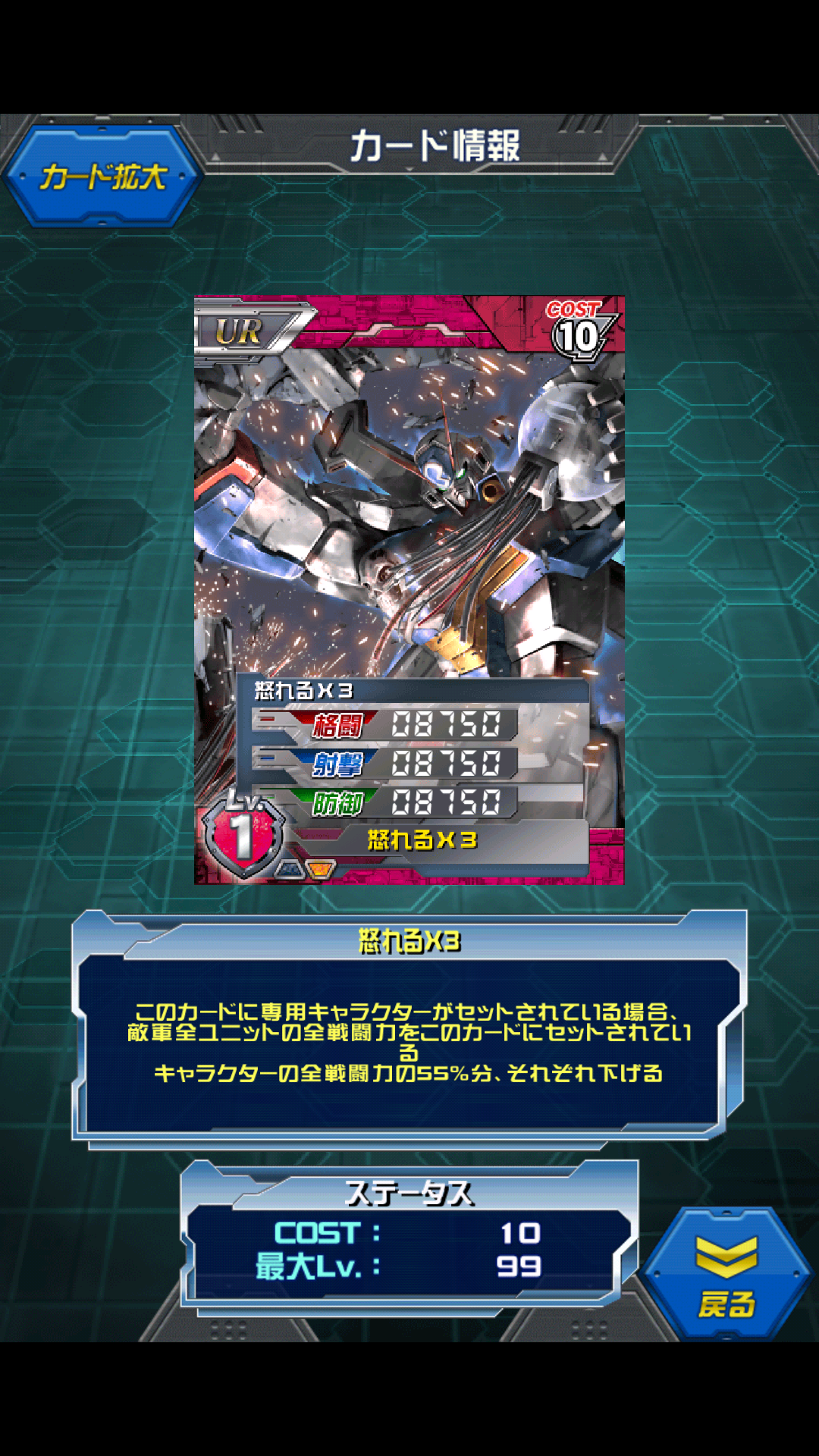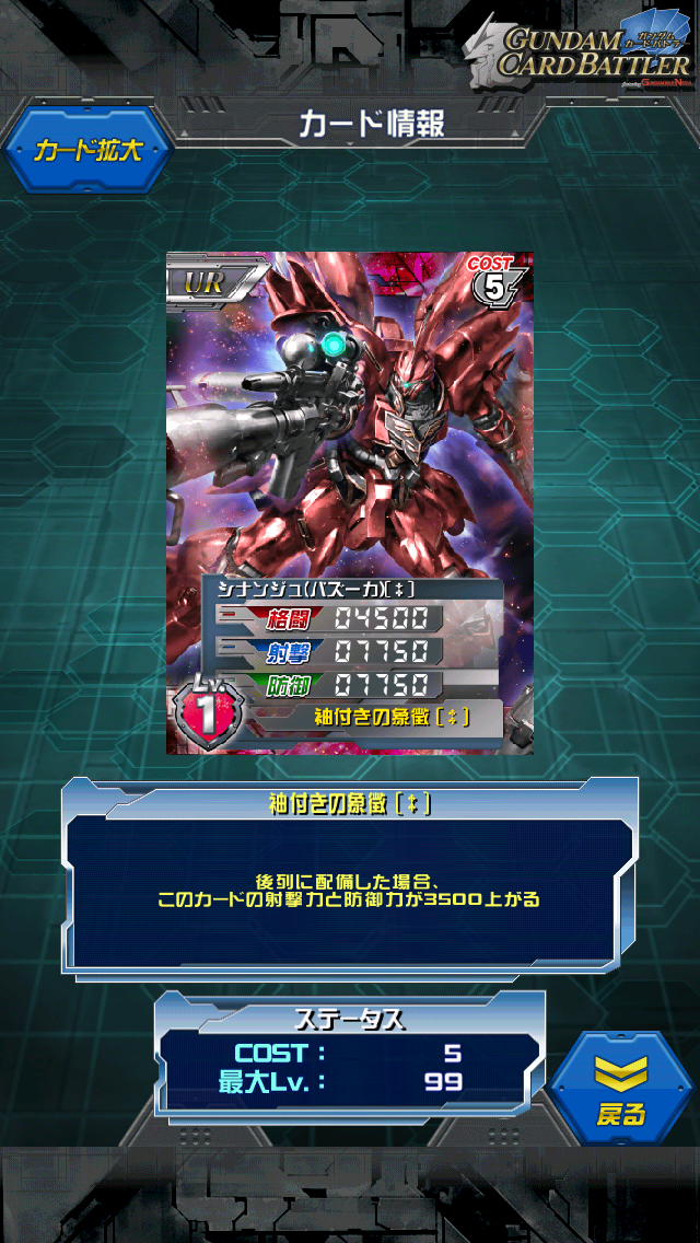 シナンジュ〔‡〕 ランキングきっつ!(挨拶 シナンジュの限界突破です。 MAX値は6500/11000/11000 後列配置で6500/15500/15500 最近のUR達と比べると低く見えますが コスト5を考えるとかなりの性能。 スキル条件の後列配置は最近は珍しいタイプ。 相手に左右されず、また言ってしまえば無人でも発動するので デッキに入れる面では非常に入れやすい。 専用キャラのフロンタルは重めなので コスト1のシャアやベラ等と一緒にデッキの穴埋めにどうぞ。 アナハイムから袖付きが奪ったシナンジュスタインをネオジオン風に改造したもの。 元々は白だったのですが あの人の怨念か呪いか赤く塗られてしまいました。 ネオジオングのコアユニット。 個人的にはアニメユニコーンのラストは ネオジオングから抜け出したシナンジュと フルアーマーが大破したユニコーンの一騎打ちが見たかったなぁ。 シナンジュの出番はゼネラルレビル強襲で終わったんです… [2回]