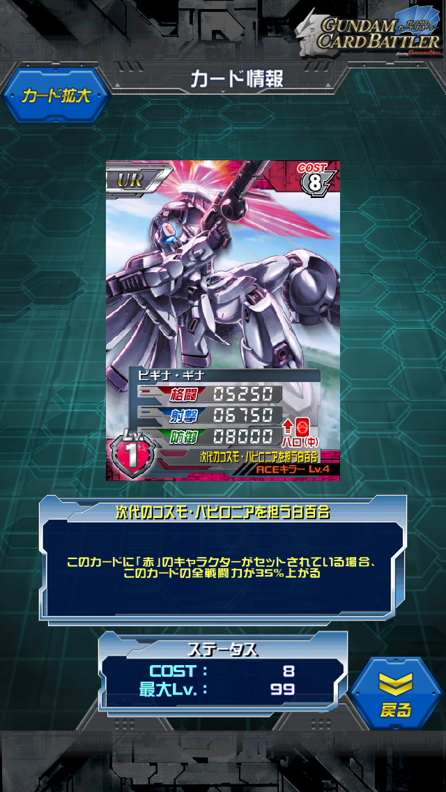 ビギナ・ギナ 2周年記念イベント URチケット交換景品 ベラの乗る貴族専用MS MAX値は7500/9500/11500 赤キャラセットで10125/12825/15525 防御寄り平均ユニット。 何かインパクトが薄いステータスですがタダみたいなURなのでこんなもんでしょう。 コスト8という点はあまり頂けませんが セシリー…ではなくコスト1ベラが乗れるところが良いポイント。 デッキコスト+30になりましたが キャラコストは+10で高コストキャラが増えているので どちらかというとキャラに困る方が多いかと思いますので 優秀な低コストキャラが乗れるところだけでも評価してあげたい。 F91に登場したベラ様専用機。 F91のストーリーは元々50話の予定だったらしいですが それを劇場版の1時間半に纏めたものだそうです。 気が付けばシーブックがF91のパイロットになっていたり 気が付けばベラがビギナギナに乗っていたり そんな場面がチラホラあります。 記憶の中でこの機体は活躍という活躍はあまりしておらず ラフレシアに手足もがれて コクピット開けられて ベラが宇宙へ投げ出された事ぐらいかなぁ… Gジェネではこの派生にビギナ・ロナというインパクトの強い機体があります [2回]