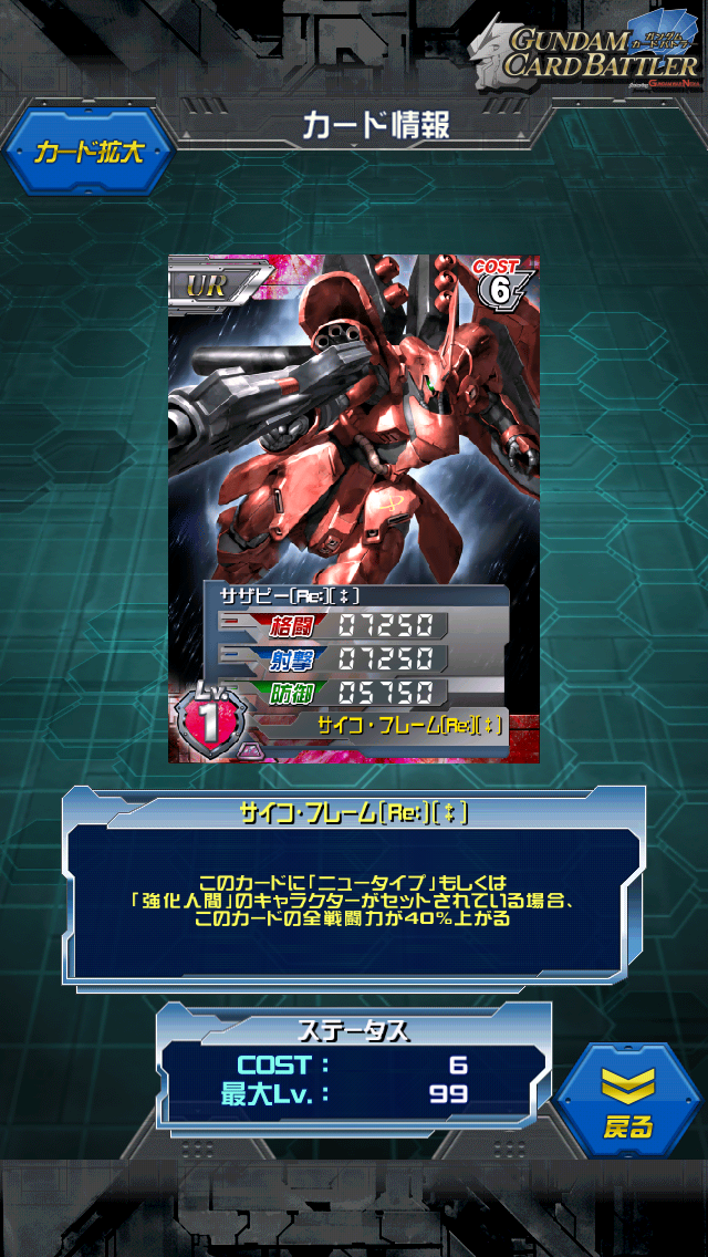 サザビー[Re:]〔‡〕 サザビーのリファインカード 懐かしいなぁ…このイラスト 赤/紫のマルチカラー MAX値は10500/10500/8250 NTか強化人間が乗れば14700/14700/11550 Re百式とは違ってNTか強化人間なので使いやすいところがポイント コスト1シャアやベラでもスキルは発動するので コスト6/1と非常に低コスト運用で使いやすい。 格闘射撃という点も事故防止という意味ではベスト。 過去のサザビーの例に漏れず シャアだけでなくクェスも専用機扱い。 ただクェス自身が射撃防御なので出番は無いかも。 シャアの最後のMS。 相変わらず「赤」 金色には飽きたのか… 腹部拡散メガ粒子砲はジェガン3機を一気に落とすほどの火力があったのだが アムロとの戦闘ではパワーダウンのため本来の性能が出せなかった。 ビームサーベル駄々っ子切りはインパクトがあったせいか EXVSでも採用される技(?)となった。 シャアの機体の中では一番好きです(*'ω'*) [4回]