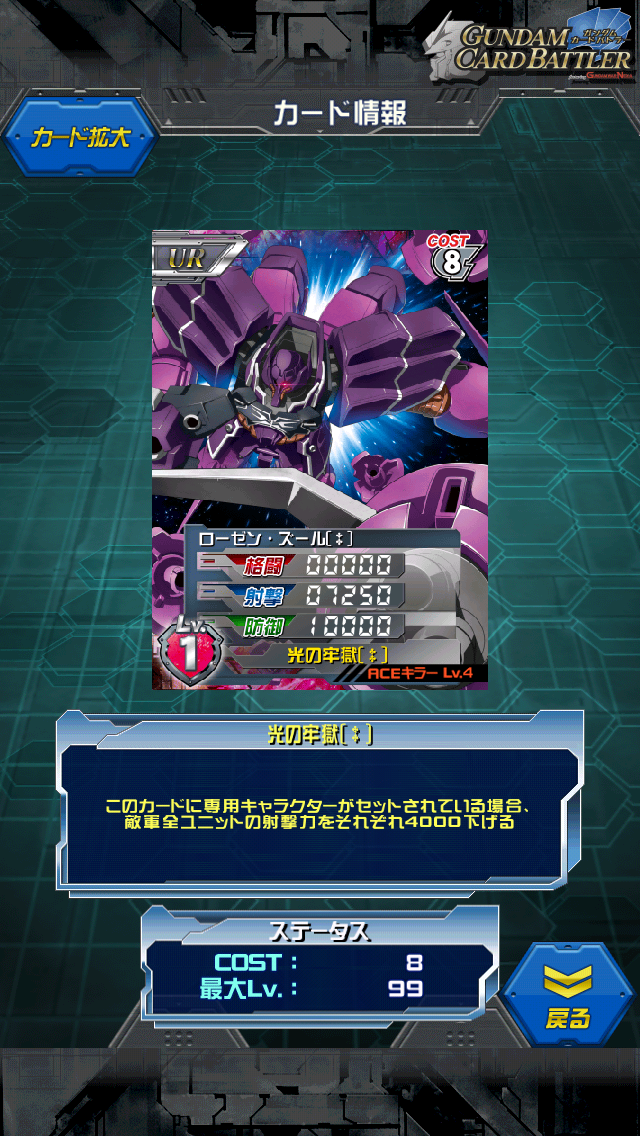ローゼン・ズール〔‡〕 紹介の前に… >イベント終了は29日ではありませんよ。 >お知らせに明記されていますので確認して見てください。 ほ、ほんとだ… 1日の…10:00!? 教えて頂きありがとうございます(;´∀`) うーん、週末にシクレ、更に29日~1日にもシクレ出そうな気がする… そこまで頑張れないかも…(;^ω^) 今回の限界突破赤枠ユニット 有線、馬鹿にしちゃいけませんよ? MAX値は0/10250/14250 専用キャラがセットされれば相手の射撃を4000ダウンなので実質防御が22250です。 生ステータスはスローネドライと一緒。 違うのは射撃だけ4000下げるか、全戦闘力を2000下げるかの違い。 そのためローゼンズールのほうが防御寄り。 射撃の4000ダウンは雑魚ACEに対しては大きすぎる値なので 実際のところ防御22250もあるように感じないかもしれません。 地味に辛いところがスキル発動条件。 「専用パイロット」 アンジェロはもちろん、フロンタルも乗れました。 …が、選択の幅が少なすぎです。 今回のアンジェロは勝利スキルと言えど発動すればかなり強力なんですが その他のアンジェロはお察し。 赤キャラ条件だけで良かったのになぁ…と残念。 ただアリーナで出会ったら嫌らしい存在かもしれませんね。 フロンタル親衛隊のアンジェロが使う紫の機体。 バナージ側からは「あの薔薇の機体」 ハンマハンマを連想させる造りになっており 一番の特徴はサイコミュ兵器を無効化するサイコジャマー 薔薇のビットで相手を囲み、フィールドを形成して中の相手を無効化させる… まるでデストロイモードを対策するために載せられた武装。 でも一番活躍したのはゼネラルレビル襲撃時だと思います。 複数の機体を手玉に取り、フロンタルに譲るような姿で去っていく姿は なかなか印象的だったかと。 [5回]PR