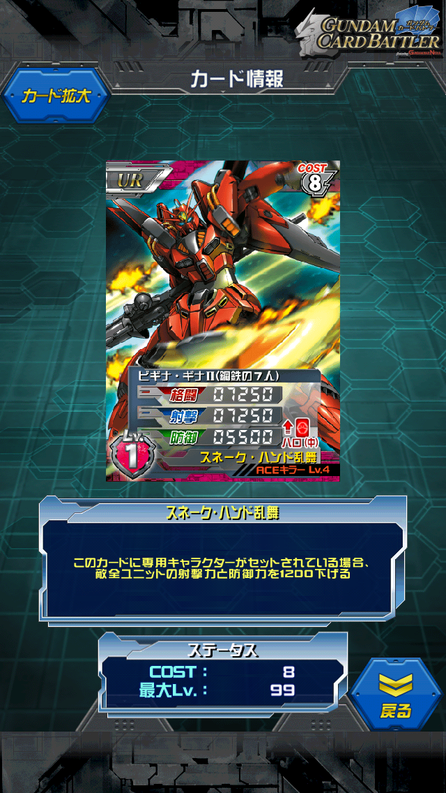 ビギナ・ギナⅡ(鋼鉄の7人) ビギナ・ギナⅡ+(クァバーゼ+赤回路)の開発ユニット マンサ、Ξに続く赤の格闘射撃URです。 MAX値は10500/10500/8000 専用キャラが乗ればスキルが発動し、 相手の射撃と防御を下げる珍しいスキル なので実質14100/14100/10400かな 今回のギリを乗せると20200/20200/13000といったところ コストを下げたΞといった感じでしょうか 格闘も射撃も出れる機体は使い勝手がいいので Ξが欲しい!けどレート高くて手が届かない…という方は 代用として使ってはいかがでしょうか ギリのクァバーゼのスネークハンドをビギナギナⅡに取り付けて ギリ専用にした機体 重力化は苦手らしく逆に宇宙戦になるとスネークハンドを振り回して活躍 最期は上半身だけの姿でコロニーレーザーに突撃 ギリの突撃の影響でコロニーレーザーの射角がずれたことで 地球が守られたため1番活躍したのは彼なのかもしれない [2回]