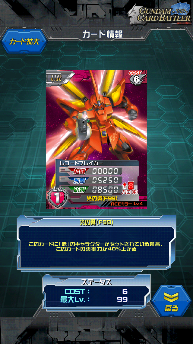レコードブレイカー 裏切りの女神ガシャ景品 最期のFシリーズ?Vとの関連性を持つMSです。 MAX値は0/7500/12000 赤キャラをセットすれば防御が16800になります。 防御が紙の赤には救世主 コスト5ではなく6なのがちょっと残念ですが 赤デッキには助かる防御特化 専用キャラはミッチェル(と本編ではあと2人)ですが スキルも赤キャラで発動するので コスト1シャアで防御20000にするもよし ハマーンやバーンズで防御を伸ばすもよしコストに合わせて乗せるキャラを 調節してください スキル名のF99にもあるようにフォーミュラ計画の1機 V2の代名詞である光の翼を搭載しており理論上は亜高速での航行が可能なため トビアは最初この機体で木星まで単独で作戦を行う予定だった。 しかし木星帝国に存在が知られてしまいコルニグスに3機とも破壊された あくまでも試作機のまま終えてしまった。 一応デザインはクロスボーンとザンスカールの中間辺り そのためクロスボーンとVを繋ぐ重要なMS ・・・まぁ圧倒的に負けて終わったんですけどね [0回]