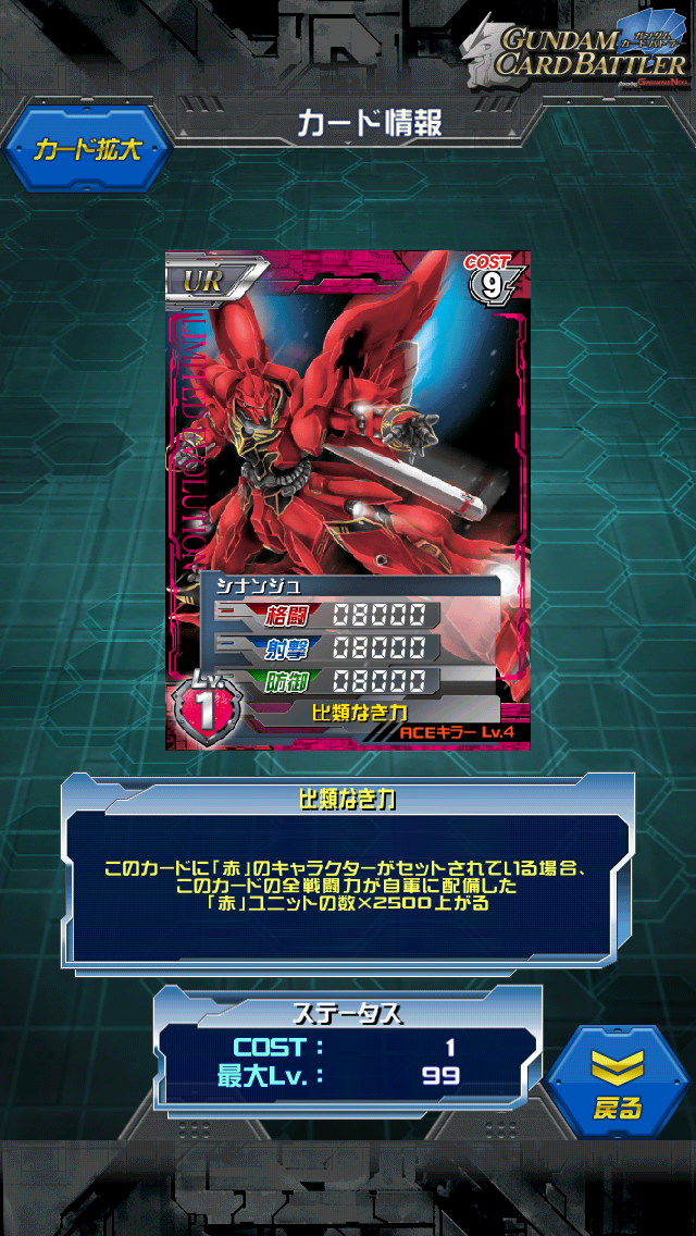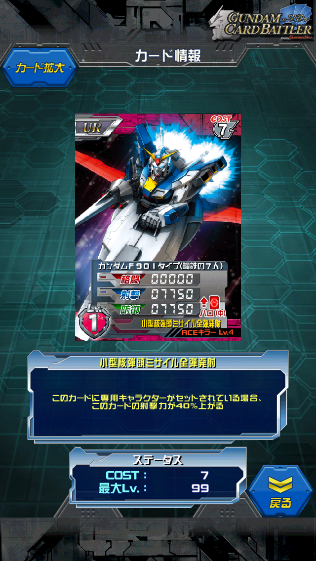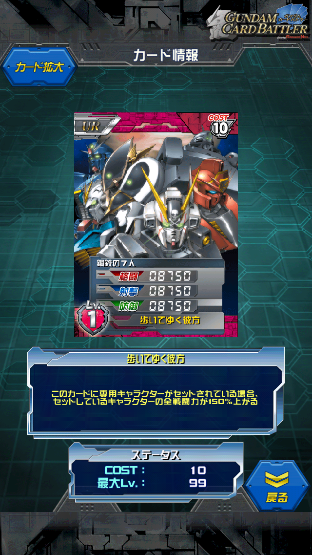 鋼鉄の7人 裏切りの女神 部隊ランキング100位報酬 シャッフル同盟以来のコンビカードならぬ部隊カードです。 MAX値は12500/12500/12500 専用キャラセットで乗せたキャラの150%上昇する まさに赤版シャッフル同盟 鋼鉄の7人なら誰でも乗れますし トゥインクやベルナデットでも乗れます。 ALL3000のUR鋼鉄の7人を乗せると単体で17000/17000/17000 鋼鉄スキルも発動するので一石二鳥 コスト9は重い、鋼鉄デッキは作るつもりはないという方は SRトビアを乗せても単体で16250/16250/16250 さらにトビアのスキルとステを足せばALL22250 悪くないと思いますよ? スキル名、歩いていく彼方は最終話タイトル まさに集大成なカードですね。 このカードに不満は無いのですが 今回はトビアのスキル名やらフルクロスのスキル名やら 何かと残念です。 「最期のクロスボーンガンダム」とかもっとあったでしょうに 「ビームはきかないっ」って... [4回]