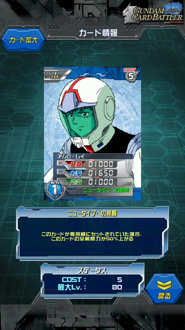 アムロ・レイ 初出はG-3と共にガチャチケ そして星一号作戦の赤コンテナにもひっそりと入っていました 別名「覚醒アムロ」 MAX値は2000/3000/2250 専用機にセットするだけで3000/4500/3375 平均射撃寄りな感じ 半年前ぐらいのカードだが今だ青では現役 乗る機体が多いのは大きな利点 スキルが発動しやすいのも利点 ただアムロの機体は射撃上昇スキルが多いので ちょっと平均ステータスには不満があることもしばしば 格闘0の射撃防御だけのアムロはいつ出るのだろうか・・・ ガンダムを知っていて知らない人はいない主人公 1st→Z→小説ZZ→逆シャア と多くに渡り出演しており大人になっていくアムロを見るのもよいかと [0回]PR