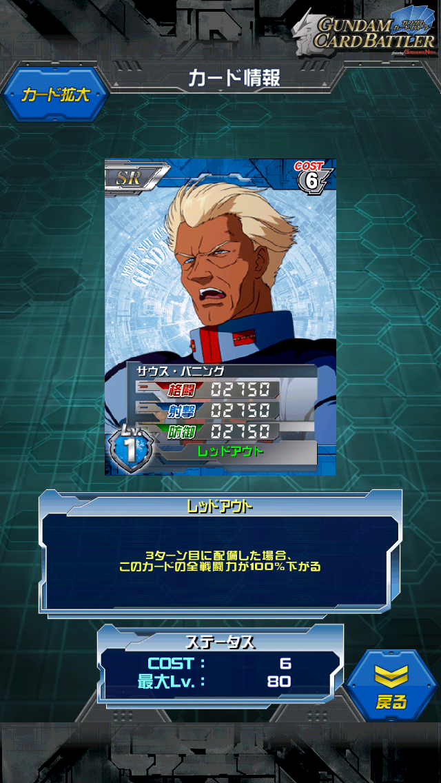 サウス・バニング 0083 アナハイムロゴガシャ景品 コウやキースの教官であり、不死身の第四小隊の隊長 MAX値は驚きのALL5000 スキルの発動無し状態で5000という数字は恐らく現時点でトップ バニング恐るべし… スキルはデメリットスキルで 3ターン目はALL0になるというかなりのデメリット ただ初期ステータスの値が大きいことは機体のスキルによっては大化けする ジムカスタムのキャラ83%アップがいい例 キャラの400%上昇させるLRに乗れたらなんと20000アップ! …乗れませんけどね… 1年戦争時に隊員が誰も死ななかった小隊の隊長を務めたことから かなりの力量だと思われる。 シーマと少し対峙しただけでお互い「只者ではない」と思わせたパイロット 星の屑作戦の秘密書類を拾ってしまったばっかりに死亡 ちなみにスパロボでは生存フラグ以前に死亡フラグすら立たない [0回]PR