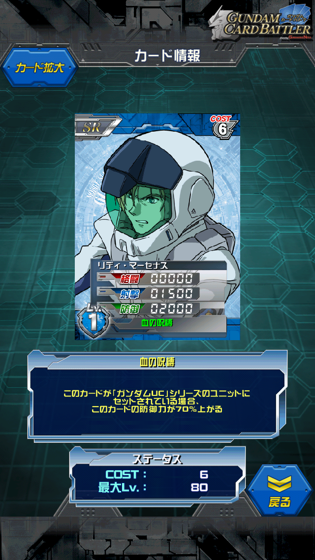 リディ・マーセナス バトルアリーナ時の防御ガチャ景品 色々ネタにされるかわいそうな少尉さん MAX値は0/2750/3500 スキルはガンダムUCのユニットにセットすれば防御が5950になります。 射撃も上がるのはよくいるのですが 防御しか上がらない珍しいタイプ 最近パイロット不足で他の色に負けそうになっている金デルタに 最大の援軍です。 ただ問題なのはコスト6という点と防御しか上がらないこと デルタに乗せれば防御22000ぐらいになるためかなりのステータスですが 逆に言うと防御しかできないユニットにコスト6キャラを乗せるのは いかがなものかと… デッキと相談ですが入れて1枚辺りが限度ではないでしょうか ガンダムUC、裏主人公…といえば聞こえはいいですよね ピエロだとか負け犬だとか色々言われているけど、まさにその通り 大人しくミヒロ少尉と付き合っていたらよかったものを 最初は戦闘に不慣れなバナージをうまくサポートするいい兄貴柄でしたが… 第3次スパロボZ後半ではマリーダにバンシィ取られるんだろうなぁ… [0回]