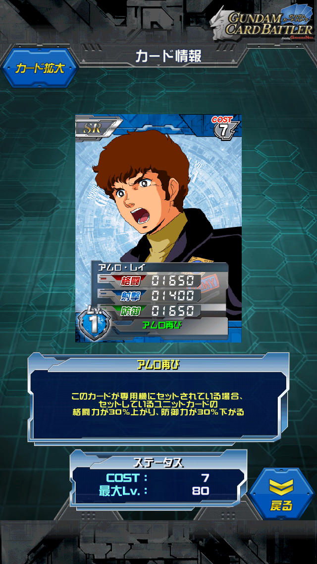 アムロ・レイ 第一次ネオジオン抗争赤コンテナ景品 とうとう待ち望んだステータスのアムロ。別名翼アムロ MAX値は0/3250/3250 2,3ターン目なら0/5525/5525です。 アムロと言えば機体とステータスが微妙にかみ合わない、 使えるけど勿体ない、というキャラが多いですが とうとう射撃防御特化のアムロが出ました。 …が、スキルはターン制限スキル 2ターン目の防御から発揮できるのは嬉しいですが 1ターン目はそのまんまの数字3250です。 専用機セットとか、相手キャラとかのほうがよかったんですが、 専用機多いし強い機体が多いから仕方ないですよね Z、ZZに登場したアムロ この頃にはガンダムに乗らずディジェやシュツルム・ディアスといったMSに搭乗 さらに宇宙に上がるとララァのことを思い出してしまうことから カミーユを宇宙へ上げる手伝いをしてZは出番終了 ZZでは多少吹っ切れたのか 「僕が宇宙に上がるのはシャアとの決着をつける時だと思ってる」 とハマーンなんて全く興味のない素振りを見せる(小説版のみ ガンダムイボルブという映像作品では Zガンダム3号機に乗るホワイトユニコーンというキャラが存在している アムロだろ?アムロでしょ?アムロなんだろ? と言われていますが真相は・・・ [1回]