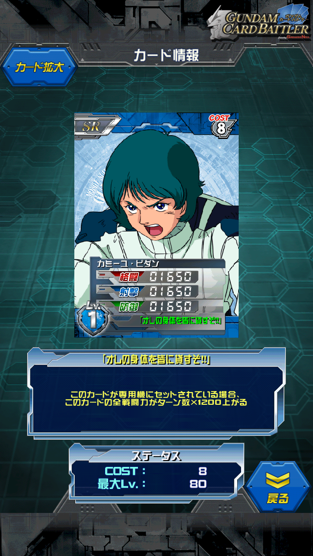 カミーユ・ビダン 機動戦士Zガンダム 地球周回軌道上 ランキング報酬 Zガンダム主人公、キレると怖いカミーユさんです MAX値は3000/3000/3000 星?ありませんが何か? スキルはターンスキルで3ターン目には6600/6600/6600とかなりの数値 …なのですがド平均なのでLRに乗せる専用みたいなものです コスト8という重いコスト、ターンスキルということもあり LR Zガンダムを持っていない人は使い道が… 最近のランキング報酬はLRに乗せるための ほぼ平均ステータスパイロットばかりなのでイマイチです 頑張るときは頑張る、こういった使う人を選ぶ場合は 次に回してスルーすることも重要だと思います 「俺の体をみんなに貸すぞ!」 カミーユと言えばこのセリフでしょう 戦場で死んだパイロット達の亡霊?を集めバイオセンサーの能力を 性能以上に発揮させるほどのニュータイプ能力 あまりに強すぎたためにシロッコの怨念?にも感じてしまい 廃人のようになってしまう。 劇場版ではファとのハッピーエンドで幕を閉じる。 どちらがいいかは人それぞれ・・・ [1回]