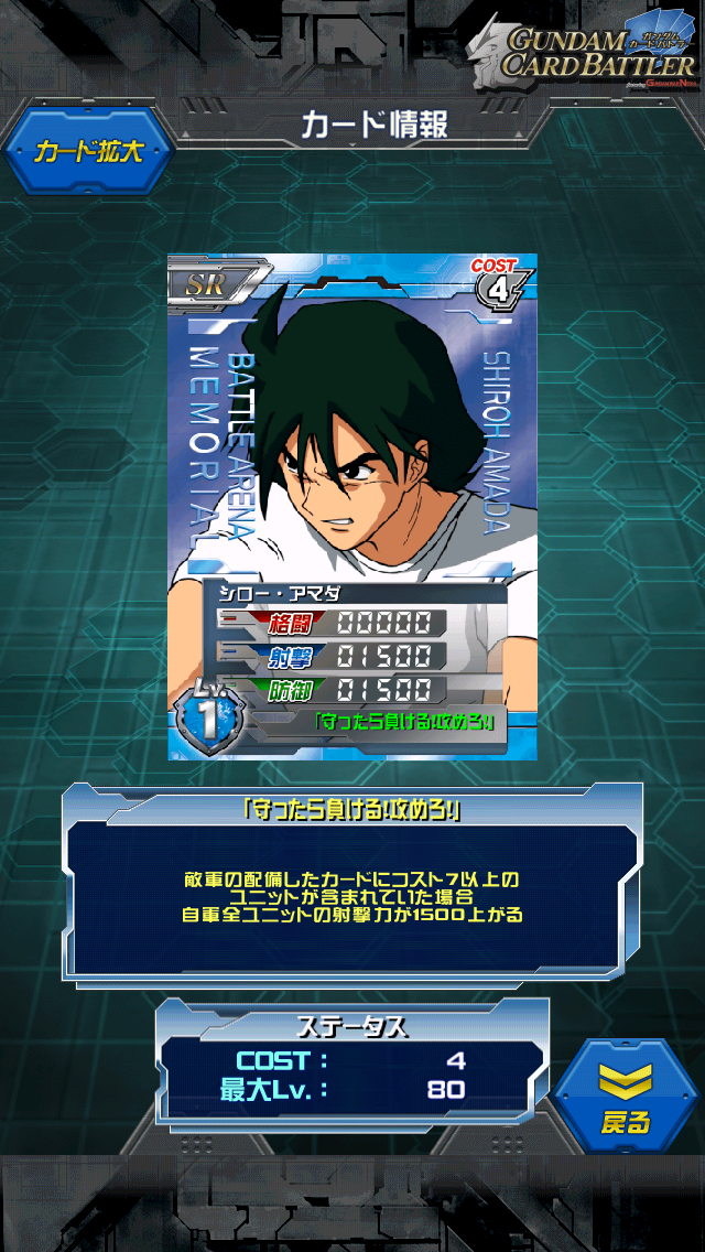 シロー・アマダ 第2回バトルアリーナ 350P交換景品 08MS小隊隊長:別名甘ちゃんです。 MAX値は0/2750/2750 敵にコスト7以上が含まれていれば実質0/5750/2750です。 コスト7以上という条件はアリーナではほぼ問題ないですが ACE戦ではヘタすると出番は敵リーダーが出てくる1ターンだけ ということもありえるため そういう意味では不安定なスキル とは言えコスト4で実質射撃6000近い数字になるのでかなり強力 メモリアル陸ガンと組み合わせれば 1000/19260/14870 コスト5/4としてはかなりのステータスになります。 先行量産型ボール、陸ガン、Ez-8が搭乗MS 最初は地上戦にも慣れず隊員から呆れられるシーンも多々ありましたが 部下思いで一直線な姿勢に惹かれ、仲間を増やしていく ジオンに毒ガスを巻かれて死んでいく人々を目にして ジオンを憎むようになる…割にジオンのアイナに一目惚れする... シーマが撒いた毒ガスと関連性があるとかないとか [0回]PR