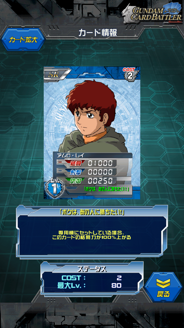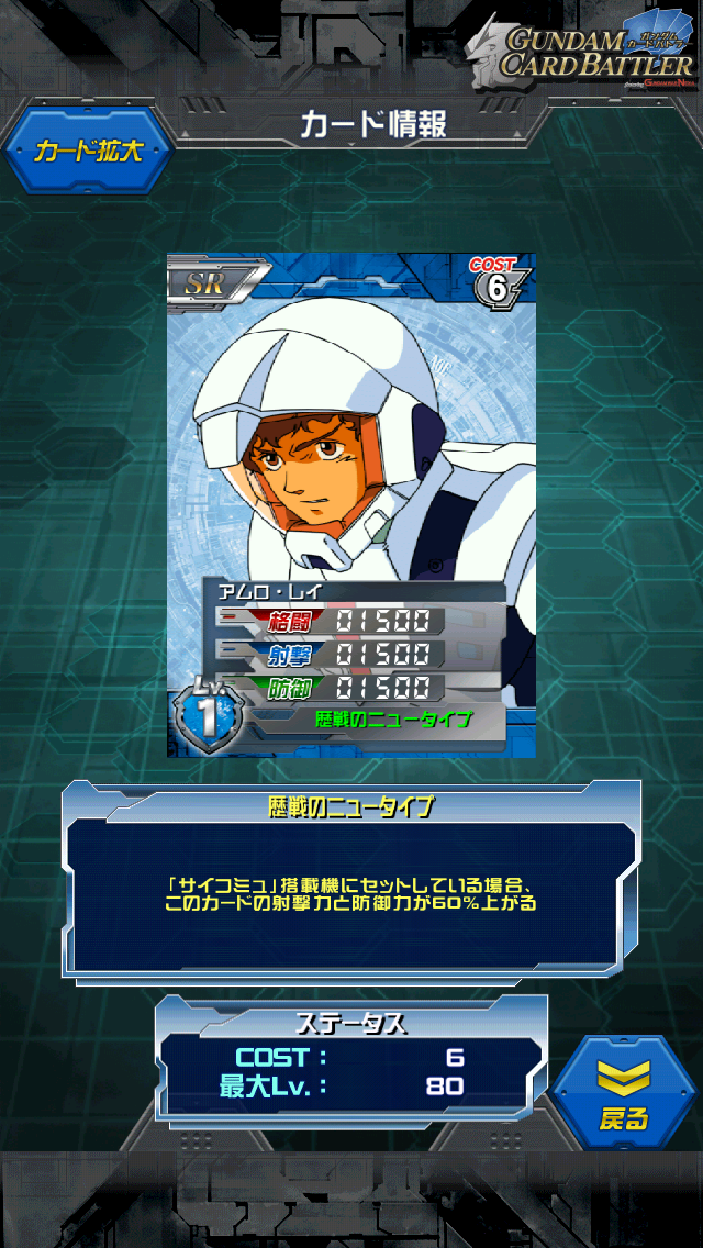 アムロ・レイ 初出はG-3と共にガチャチケ そして星一号作戦の赤コンテナにもひっそりと入っていました 別名「覚醒アムロ」 MAX値は2000/3000/2250 専用機にセットするだけで3000/4500/3375 平均射撃寄りな感じ 半年前ぐらいのカードだが今だ青では現役 乗る機体が多いのは大きな利点 スキルが発動しやすいのも利点 ただアムロの機体は射撃上昇スキルが多いので ちょっと平均ステータスには不満があることもしばしば 格闘0の射撃防御だけのアムロはいつ出るのだろうか・・・ ガンダムを知っていて知らない人はいない主人公 1st→Z→小説ZZ→逆シャア と多くに渡り出演しており大人になっていくアムロを見るのもよいかと [0回]