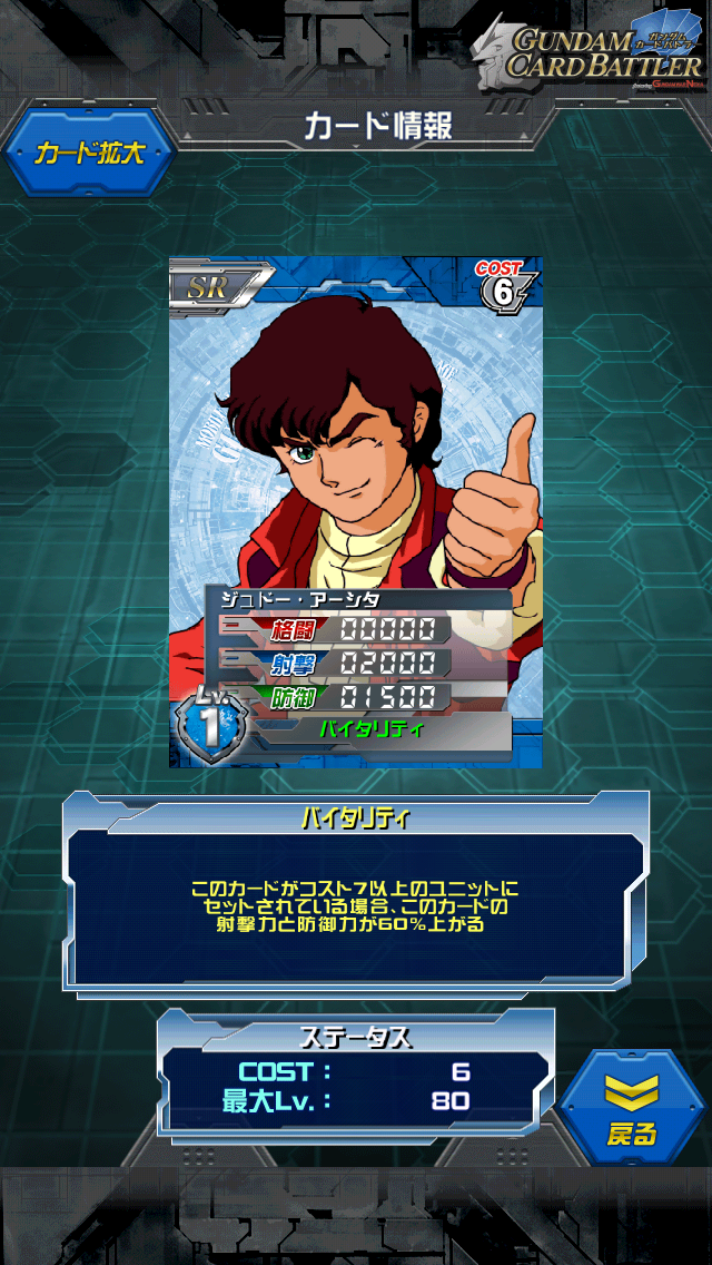 アムロ・レイ 初のSRアムロ MAX値は2750/2750/2750 スキル発動で2750/4400/4400 決して悪くはない、、、のだがSRコスト5アムロが出てきており さらにそちらのほうが射撃が高かったり、格闘が高かったりしたりと ちょっと微妙な存在に もちろんアベレージではコスト6の意地を見せ勝っているのですが 他のアムロが専用機スキルに対してこちらはサイコミュ限定スキルなので ほぼνガンダム一択のパイロットとなっているのもイマイチな点 どうせνガンダム一択のアムロだったら 格闘をもっと下げて射撃に振ってくれればいいのに。。。 時代の波に押されつつある1枚 [0回]