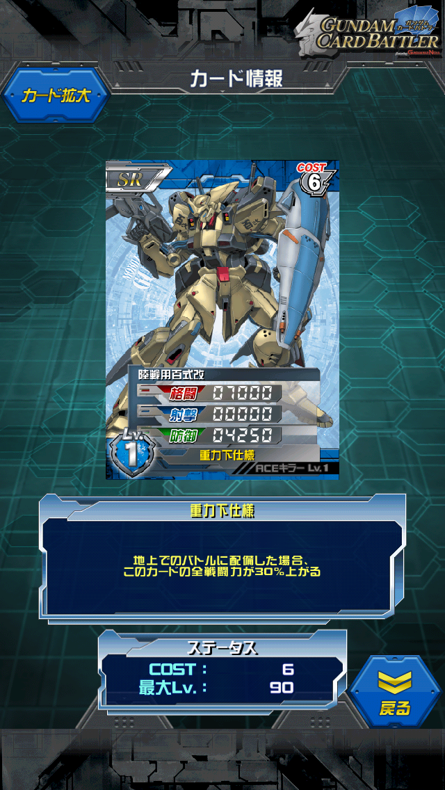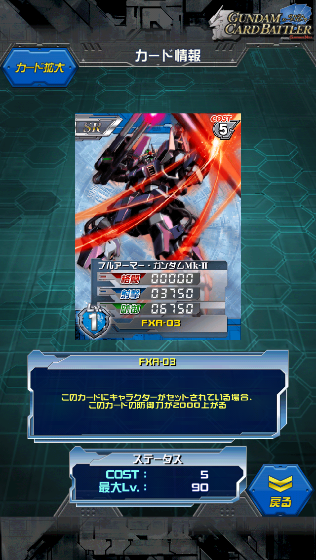 フルアーマー・ガンダムMk-Ⅱ 第一次ネオジオン抗争赤コンテナ景品です 開発素材で1000個中2個しか入っていない無駄に貴重なカードです MAX値は0/5500/9500 キャラをセットすれば防御11500になります。 青の防御ユニット しかし青の防御はデルタの天下なのでコストも同じということから デルタを持っている人には全く必要のないカードです。 ただ逆に持っていなくてアレックス辺りで頑張っている方にとっては 使い道のあるカードではないでしょうか まぁ基本はフルアーマーZZに繋げるのがいいのではないでしょうか 専用パイロットはカミーユ、クワトロが乗れたので ガンダムMk-2に適正があれば可能なのではないでしょうか フルアーマーガンダムのMk-2ではなく ガンダムMk-2のフルアーマープランです。 これもまぁ…あまりしゃべることができないのですが フルアーマーって何かとロマン溢れる言葉です 何がロマンかというとパージする瞬間ですね やられたと思ったら中身が飛び出しフィニッシュ…といった流れが好きです デュエルやガンダムではないですがグレンラガンとかはまさにそれですね [0回]