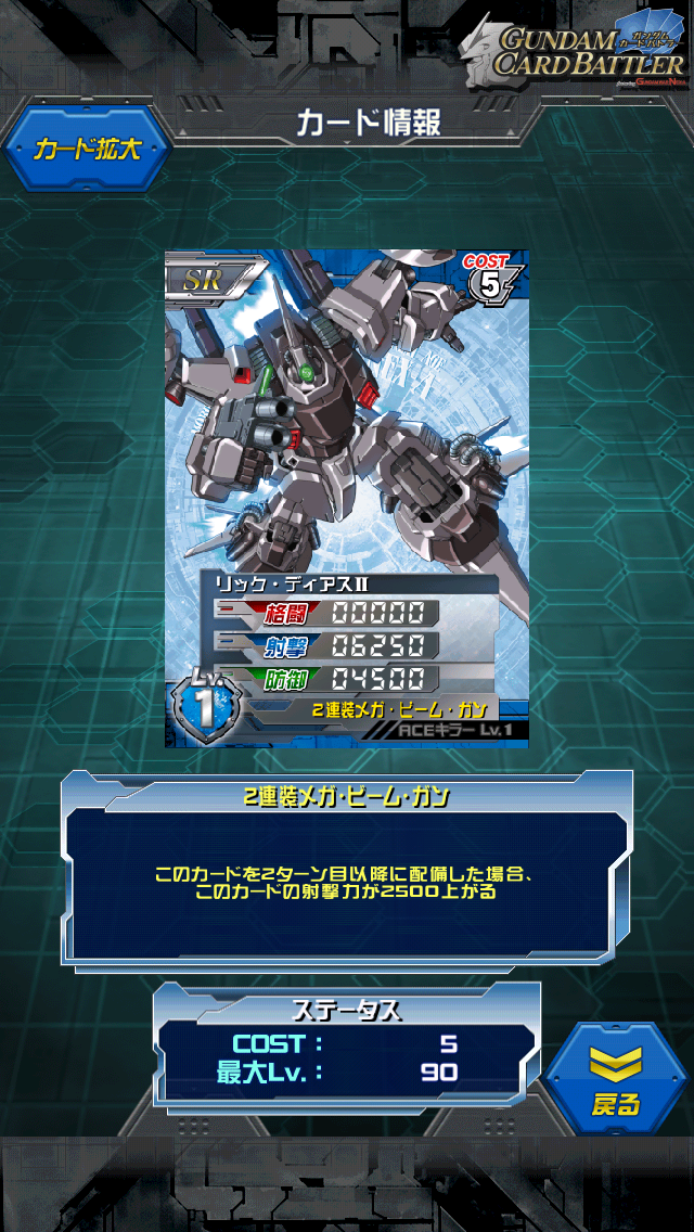 リック・ディアスⅡ シュツルム・ディアス+メタス改の開発ユニット 出展?知りませんが何か? MAX値は0/9500/6500 2ターン目以降は射撃が12000になります。 ターン数で変化ではなく3ターン目だろうと+2500なので 同コストのスローネアインと比べると圧倒的に負けているのですが 青のコスト5射撃機は意外と珍しく数値としても悪くなかったりします。 コスト7になるとνやら色々と現れるのでそれまでの繋ぎや 穴埋めにはよいのではないかと 何気にアムロ、クワトロが乗れます。 リックディアス、又はシュツルム・ディアスに乗れたら適正ありになるっぽいですね ちょっと調べてみるとZ-MSVだそうで ZZのダブルビームライフルの試作型を持っているそうですね。 と言うことは時代はZとZZの間ってことでしょうか 開発素材のシュツルム・ディアスのほうが後期なんじゃないだろうか… [0回]