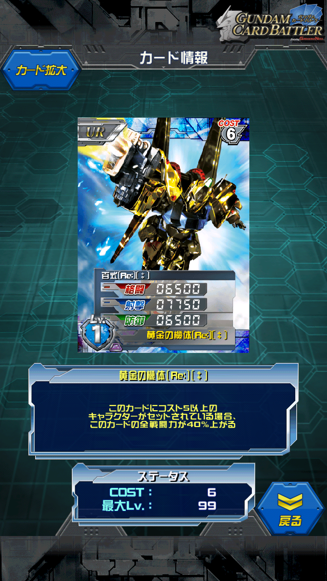 百式[Re:]〔‡〕 後半戦に入ったのでやっと開発できました。 百式のRe…リファインカードという意味かな MAX値は9250/11000/9250 コスト5以上のキャラセットで12950/15400/12950 射撃寄りなコスト6UR キャラコスト5以上なのが意外と難儀したり… 現在の環境だと変なコスト5キャラを置くよりも コスト1キャラのほうが強かったりするので デッキによっては入れることが難しいかもしれません。 ステータス自体はタダで貰える割に‡付のこともあり優秀なので ユニットコスト、というよりもキャラコストが余っているのなら 使えるカードだと思います。 百年使えるようにと願いの込められたMS。 金色の装甲は目立つだけではなくビームコーティングの役割を持つ。 アニメでは出てきませんが金色に憑りつかれた技術者がいるようで 百式改やらフルアーマーやら陸戦型やら… そんなに戦場に金色を送ってどうする… [3回]