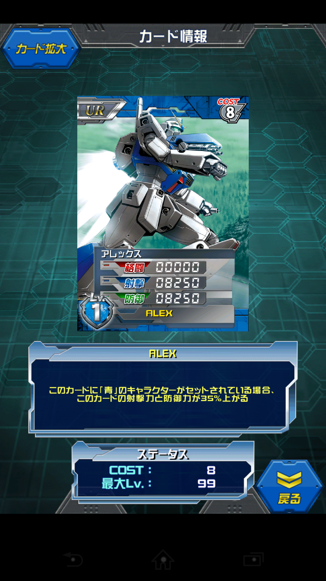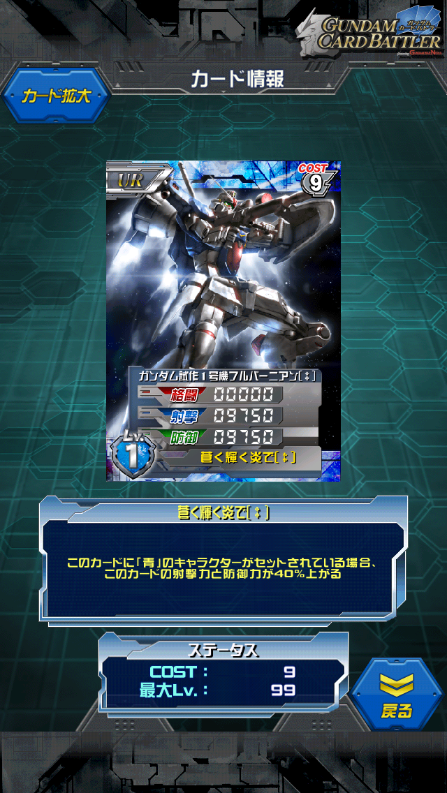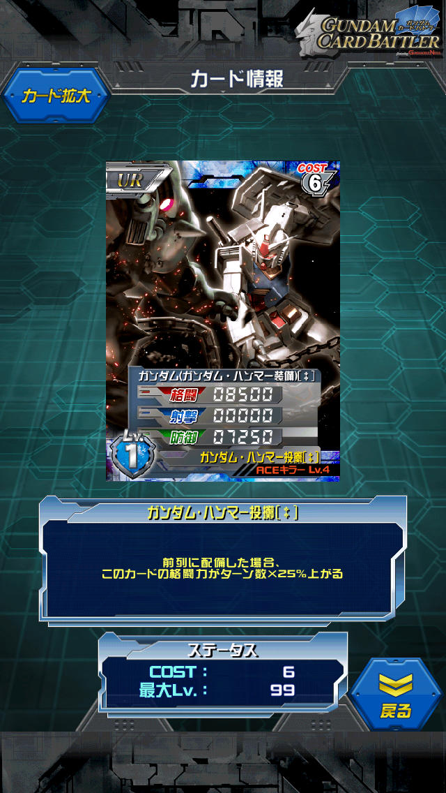 ガンダム(ガンダム・ハンマー装備)〔‡〕 首を長ーくして待ってました。 待ちすぎてLRの時代が来てしまいました… MAX値は12000/0/10500 前列配置で格闘がターン数×25%上昇なので 15000→18000→21000というステータス 元祖格闘特化UR。 一番凄いところは無人でもスキルが発動するところ。 前列に配置するだけで発動するというお手軽スキルに加え 3ターン目なら2万超えるというコスト6ではかなりの爆発力 複数枚はデッキに入れる必要はありませんが 穴埋め要因としては色関係なく、パイロット枠も取らないという点で優秀。 ただ勘違いしてはいけないのが 所詮コスト6というところ。 LRの生ステータスは基本2万なのでどう頑張っても勝てません。 事故防止の格闘ユニットと見たほうがいいです。 私が初めて入手したUR。 赤コンテナキャッチで出たときは嬉しかったなぁ…(*´ω`) 鉄球を武器にするというビームの時代に反する原始的な武器。 ですが∀も使うし 似たような武器としてボルトクラッシャー(!?)もあったりと 単純、かつ強力な武器としてちまちまガンダム作品に登場する。 威力だけでなく人気もあるようで Wiiのゲームで様々なハンマーを使うガンダムゲームにしては異質な アクションゲームも出たりしている。 スパロボ、Gジェネではよくガンダムの最強武器に位置する。 射程が5の位置しかなかったなぁ… [3回]