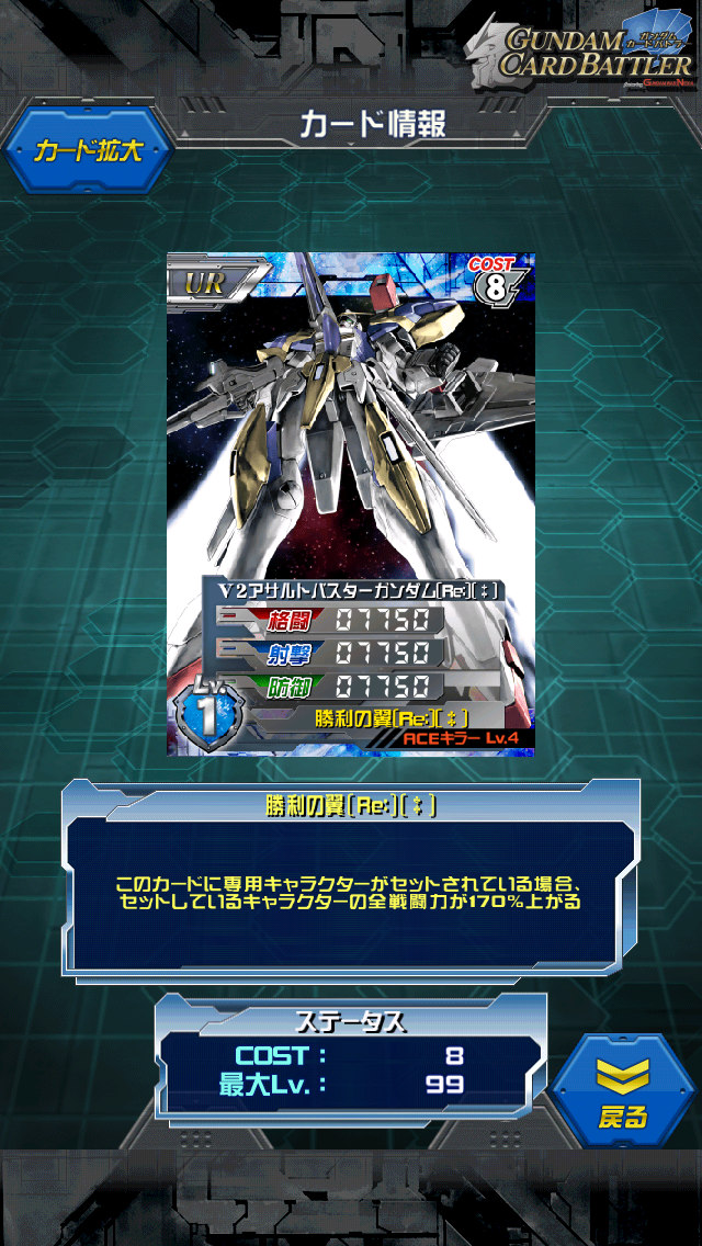 V2アサルトバスターガンダム[Re]〔‡〕 かつて高難易度の開発ユニットとして恐れられた(?)V2が帰ってきた! 今回は撃墜数報酬です。楽ですね MAX値はALL11000 専用パイロット乗せれば170%アップ 今回の覚醒ウッソはALL3250なので170%で5525アップでALL16525ですね。 ド平均のコスト8 悪くはない…はずなのに何かパッとしない。 穴埋め要因にしてはコスト重め、かつ専用パイロットを要求するところが 使いづらさを加速させてる気がする。 タダで貰えるユニットってことなのでしょうか… ふつーに青キャラセットで使わせてくれれば良かったんですが… 逆に考えると今後のウッソ次第では逆転ホームランもありうるユニット それまでは…倉庫かなぁ(;^ω^) V2の全部乗せver アサルトパーツとバスターパーツ、2つ乗せりゃいいじゃんという考え方。 現在の宇宙世紀では最後のガンダム…になるのかな? そういう意味では最強のガンダムとして候補に挙がっていい機体。 今度プラモでHGUCとして出るのがちょっと気になってます。 できればMGで出してほしいんですけどねー 1/144は買うとキリがないので…(;^ω^) [1回]PR