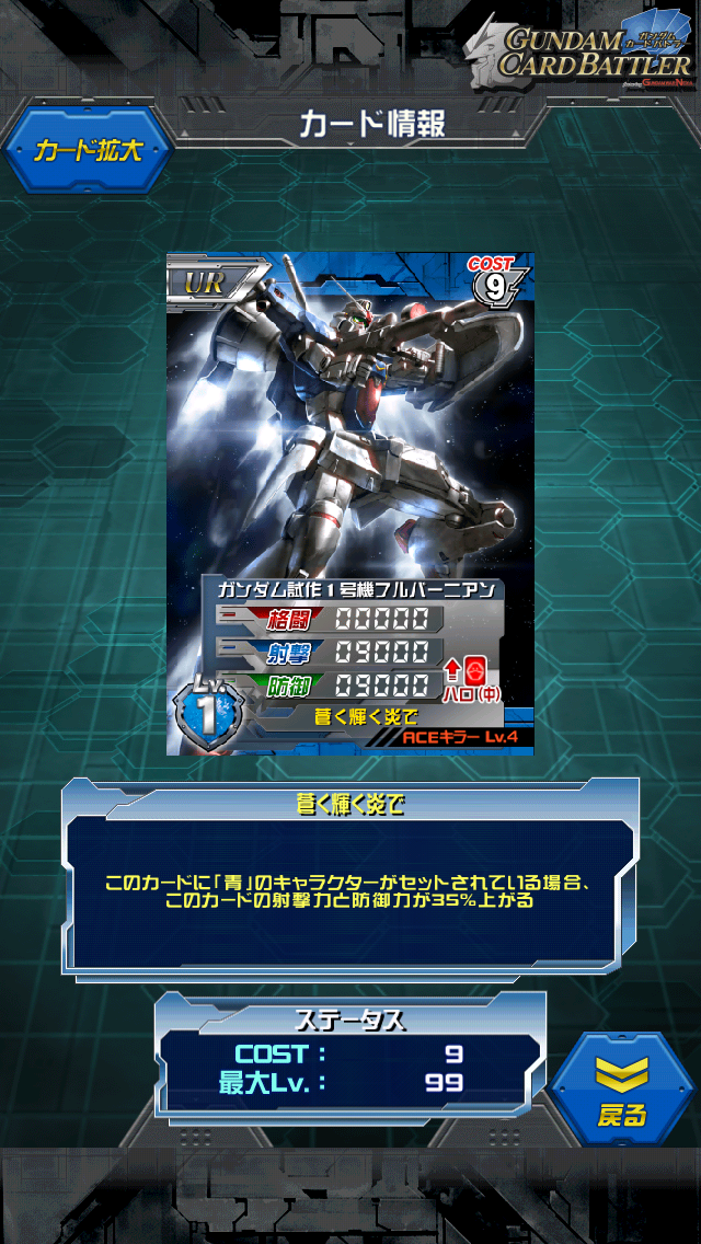 ガンダム試作1号機フルバーニアン 0083アナハイムロゴガシャ景品 ぎりぎりで出てくれました、今回のイベントの目的。良かった… MAX値は0/12750/12750 青のキャラセットで0/17212/17212です 青によくいる射撃防御タイプ 珍しいのは専用キャラセットでもNTセットでもなく青キャラセットと言うところ 何でもいいのでコウはもちろん 病人カミーユだろうが何でもOKです。 ダブルフィンファンネルが少し力不足になってきたら いい入れ替え機体だと思います。 ガンダム試作1号機の宇宙換装型 武装自体はビームサーベルにライフルといった一般的な装備だが コアブロックシステムを利用したパーツ分離や 圧倒的機動力で活躍しました。 最終的には2号機と相撃ちになり、記録から抹消された機体。 プラモのRGに選ばれていることからなかなか人気のある機体なのでしょうね [0回]PR