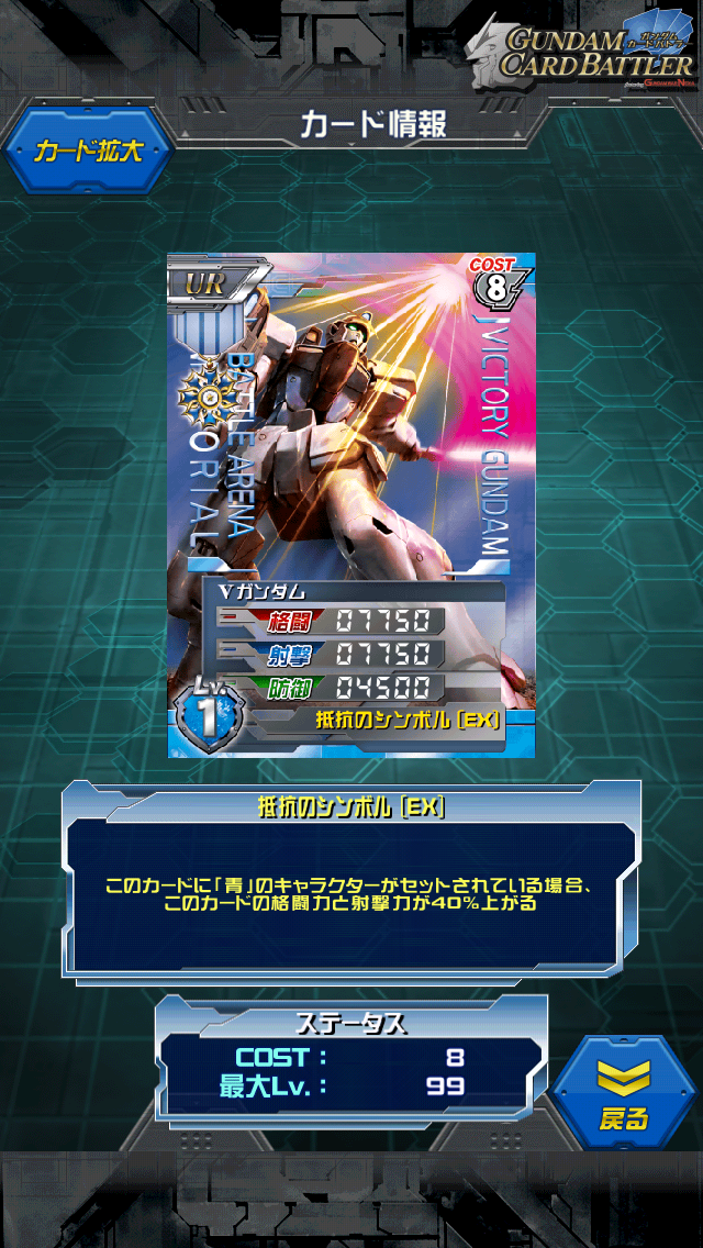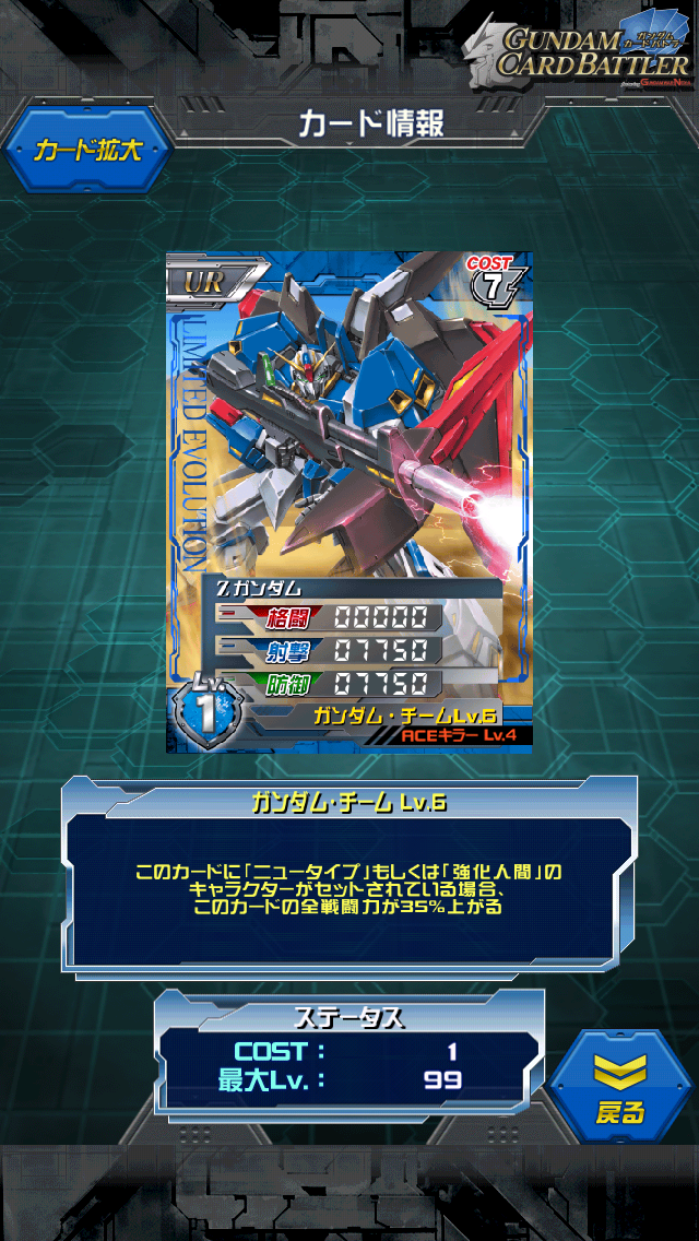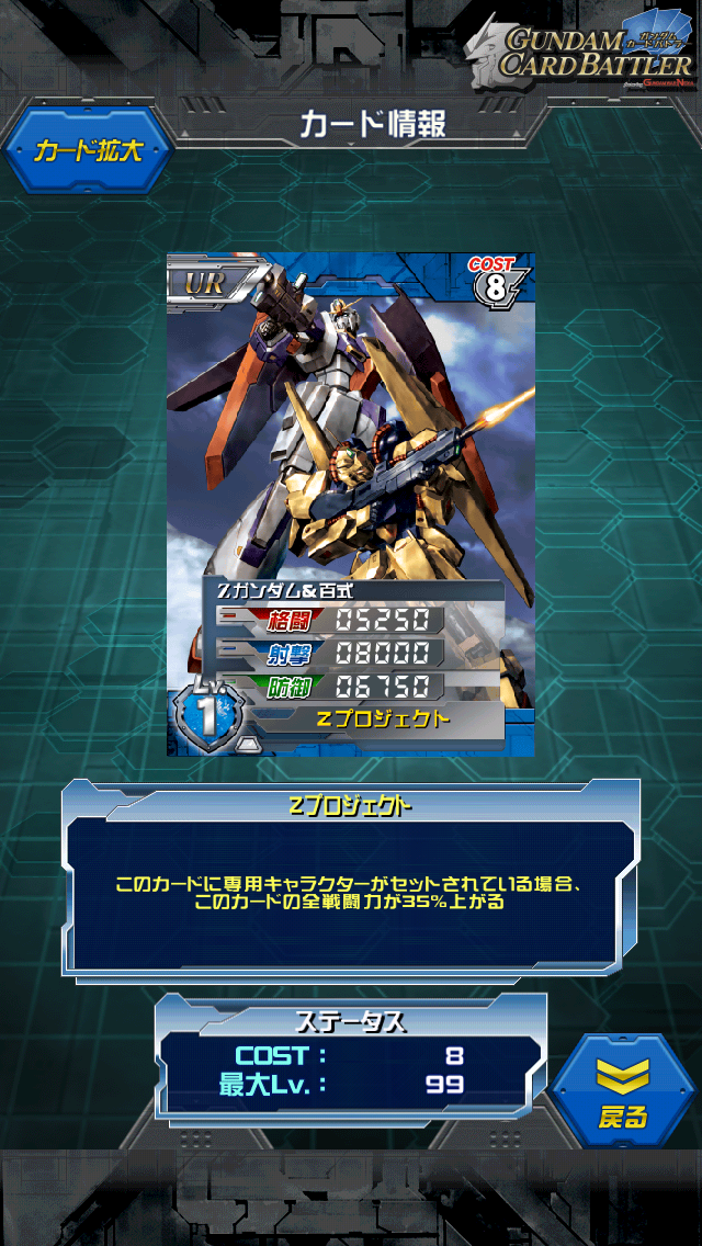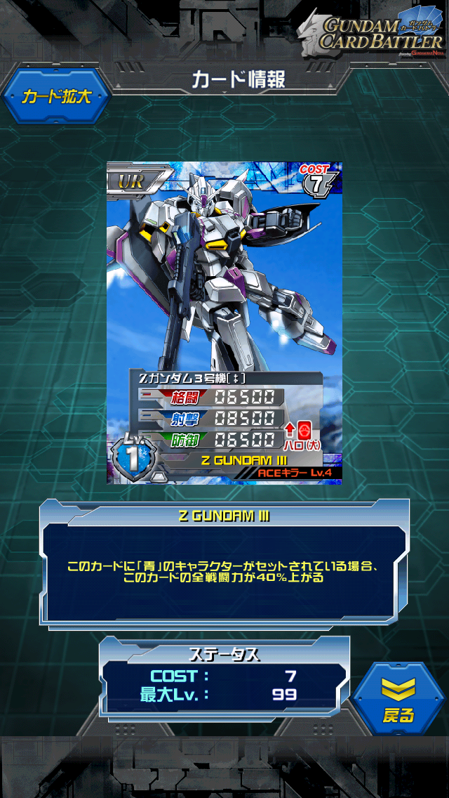 Zガンダム 第4回限定強化イベント 最大強化ユニット Z計画の完成系。未だに色あせないカッコよさ。 MAX値は0/11000/11000 NTか強化人間セットで0/14850/14850 青にありがちな射撃防御機 なのだがコスト7では何気に初めて? コスト8帯で射撃防御URはかなり数がありますが コスト1足りなくて入らない…という場面にスポっと入ってくれるかと。 スキル発動も青ならそこまで困難で無いし 専用パイロットもカミーユに始まり、 ジュドー、ルー等々数多いため使いやすい。 複数は必要ありませんが1枚はあると便利ですので是非。 Z、ZZと2作品に渡り活躍したアナハイム製MS。 Zではインチキパワーを披露したZですが ZZではただの可変機という扱いに。 いきなりジュドーに売られそうになっていましたが ZZが出るまではジュドーの機体に。 ZZ登場後も小回りが必要な場合はZを使うことがあったため 機動性は健在であったのかと。 Zカッコいいですよね。 初めてのRGがZでした(*´▽`*) …変形を試そうとするとパーツがポロポロ取れるので困りました(;O;) [2回]
