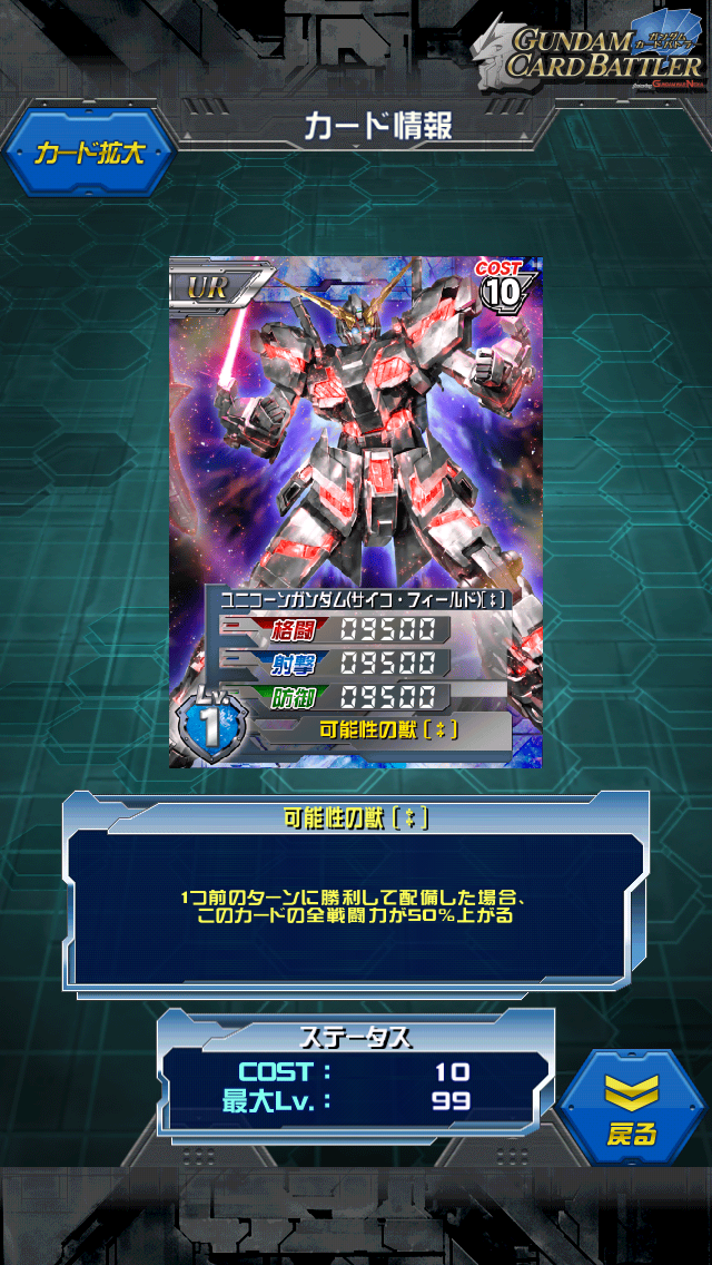 ユニコーンガンダム〔‡〕 限界突破のバーゲンセールですね。 微課金ユーザーとしては手に入りにくかったカードが手に入るのは嬉しいです。 MAX値はALL13500 前ターン勝利でALL20250 見たまんまのド平均ユニット。 単色コスト9ALL19000に勝っているとはいえスキルが条件付きなのが残念。 そろそろゼクツヴァイ枠のユニットに名前でも付けましょうか… URバナージをセットしたいところですがアチラは入手困難なので 乗せるならその他になりそう。 射撃バナージ、ド平均バナージ、防御オードリー… スキル発動にキャラ条件が無いので あまり拘らずに乗せてしまうのも一案。 デッキコストが上がっているのでこの辺りを1枚ぐらい入れても 構わないと思います。 RX-0の形式番号を与えられた全身サイコフレームの実験機。 コクピット周りだけのサイコフレームで アクシズショックのような現象を発生させたものを 全身に使うとどうなるか?という開発者の好奇心で作られた機体。 しかも調子に乗って3号機まで作ってしまった始末。 そろそろ0号機が出ると思うんですけどねぇ。 シナンジュスタインがその役割かな [1回]PR