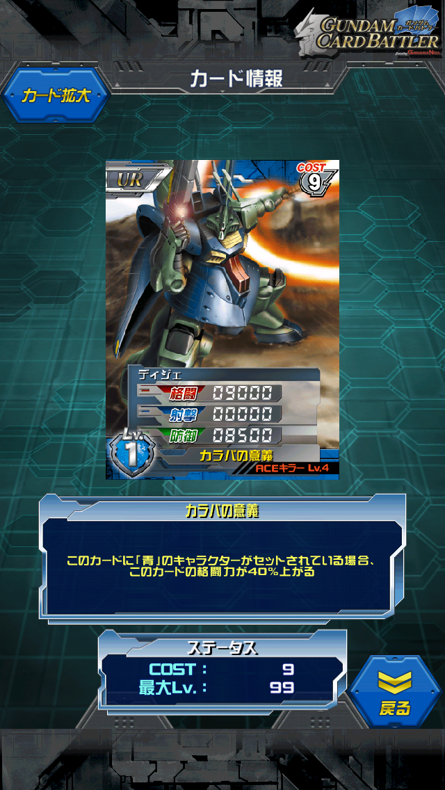 ディジェ 機動戦士Zガンダム 地球周回軌道上 ステップアップガシャ景品 アムロの乗る数少ないガンダム以外のMSです。 MAX値は13000/0/12000 青には珍しい格闘機。青のキャラが乗れば格闘が18200になります。 専用パイロットはアムロのみ(多分 クワトロが乗れれば良かったんですが… 格闘しか上がらないのは残念ですが青キャラなら誰でもとりあえず乗せれば スキルが発動するのはエピオンにはない強み 格闘不足な青にはなかなか良いカードではないでしょうか Z時代にアムロが乗ったMS ビームライフルにビームナギナタとゲルググの色を強く持つ アムロがガンダムではなくこれに乗っている理由としては 「カミーユの影が薄くなり主役を食ってしまうから」とか… また、デザインした方も元々はアムロが乗ると思っていなかったらしいです 逆にアムロらしくないから選ばれたのかもしれませんね [0回]