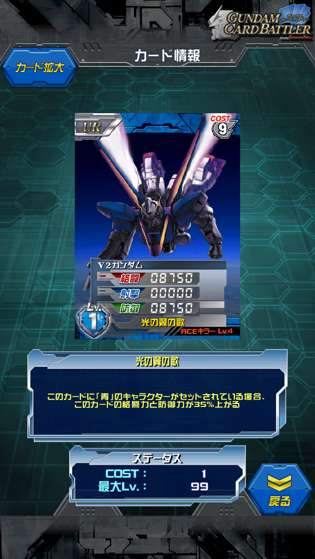 V2ガンダム 第2回強化イベント 強化カード 宇宙世紀最後?のガンダム V2ガンダムです MAX値は12500/0/12500 青キャラセットで16875/0/16875 純粋な格闘防御機 格闘が中々不足がちな青にとってはかなり有難いカード ただウッソ君がド平均パイロットなので 真に生かせるとは言い難いので惜しいカード ただ青キャラさえ乗ればスキルは発動するので 今回のシャクティが中々いいんじゃないかな?と思います。 Vガンダム後半の主役機 ・・・の割に量産されているガンダム 本編ではウッソ機とオリファー機、外伝では青いV2が登場したりしています アサルトパーツやバスターパーツを装備していない状態は 光の翼以外ははっきり言って地味な機体 ちなみに小説ではセカンドVという別機体があります [1回]PR