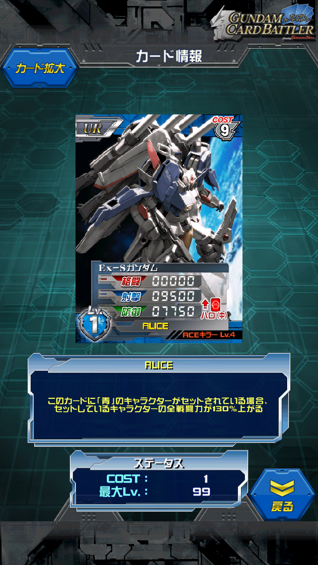 Ex-Sガンダム 機動戦士Zガンダム 地球周回軌道上 改造イベント ガンダムセンチネルよりEx-Sガンダムです。 MAX値は0/13500/11000 コスト9、射撃寄りの射撃防御機というコンセプトは ガンダム(マグネットコーティング)と同じ 違うのはスキルでこちらは乗ったパイロットのステータスに影響されるということ 専用パイロットはリョウ・ルーツですが 青のキャラなら何でも良いのでバニングを乗せてみると面白いかと 素のステータスALL5000なのでEx-Sのスキルが6500上昇になり 6500/20000/17500 バニングのステータスも加わり11500/25000/22500とかなりのもの …ただ3ターン目には5000下がりますが… Z計画ある意味最終形態 S(スペリオル)ガンダムの強化形態 Extraordinary(並外れた)S(スペリオル)ガンダムとなっております。 人工知能ALICEが搭載されており勝手に動き防衛反応を取ることも このアニメ化を無視したデザインが個人的に大好きです。 Ex-Sと言えばビームスマートガンを横に構え、どしりとした姿 最高ですよね(*´▽`*) また、強化プランとしてディープストライカーというものもありますが その話はまた今度… [1回]PR