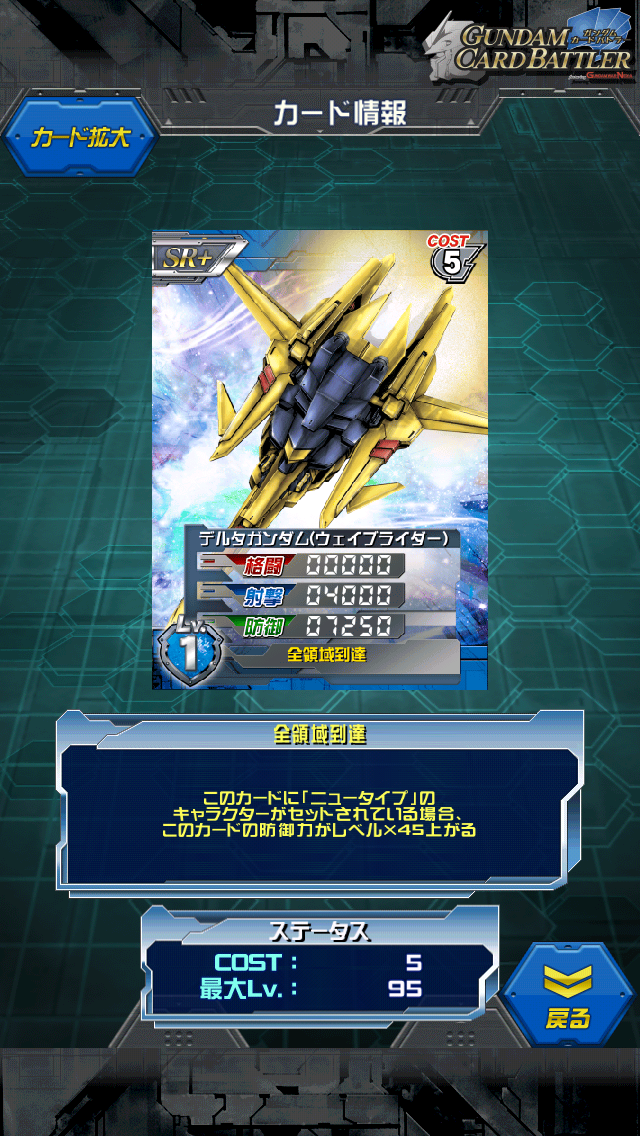 デルタガンダム(ウェイブライダー) デルタウェイブのエボ機体 青のデッキの必需品。別名金のスイカバー MAX値は0/6000/10750 NTをセットすれば最大0/6000/15025 1年以上前から出ているのにも関わらず 未だにデッキに投入される頼れる壁カード。 このカードが出た時期はデルタ自体が強かったのにも関わらず エボ対象となって軽く荒れたことも… 専用キャラはリディ、クワトロだがカミーユやオードリーを乗せて デッキコストを浮かしつつ防御を固めるのもアリ 射撃はまぁオマケみたいなものなので最大の特徴の防御を生かしたいですね。 真の百式と呼ばれる?デルタガンダムの変形状態 元々百式はZ計画の一環として作られたもので 変形機構を取り付けたかったが断念したのが百式 時代が進み技術が発達し変形できるようになったのがデルタガンダム スキルではNTを要求してきますが サイコミュ搭載してたっけ? [2回]