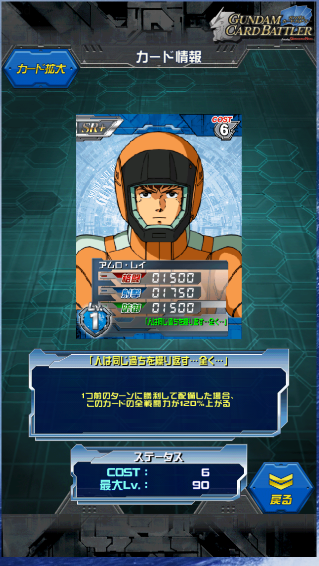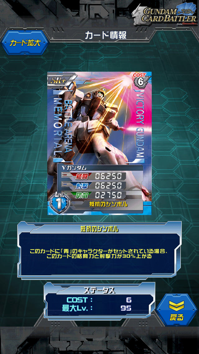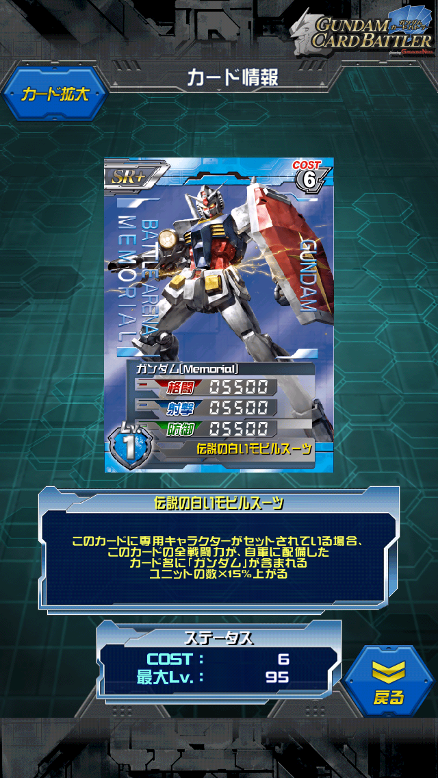 ガンダム(Memorial) 第3回バトルアリーナイベント 1000P交換景品 初期デッキのエースカードが帰ってきた!懐かしい… MAX値はALL8000 自分の場のガンダムの数×15%上昇なので最大45%上昇のALL11600 ド平均ステとパーフェクトガンダムと役割は同じ コストが低い分青デッキには不安定なスキルとなっています。 まぁ青はガンダムだらけですし 茶や白にも入れれないことはないカードです。 注意点はデビルガンダム同様に カード名に「ガンダム」が入っていないとダメな点 見た目ガンダムだらけのシャッフル同盟や (恐らく)リファイン・ガンダム・ゼータの略のリガズィもNG ガンダムタイプでないところに注意してお使いください。 伝説の始まり、連邦の白い悪魔 アムロが乗ったガンダムは2号機というのは有名な話 奪われない2号機って珍しいですね ある意味アムロに奪われましたが(笑) 当時は最強の機体…だったが NTとして覚醒していくアムロにとっては反応が鈍く感じられるようになり マグネットコーティングという(地味な)強化をされる。 その後「ガンダム」は象徴となり 特別な機体に名づけられるものとして宇宙世紀では語り継がれる... [3回]