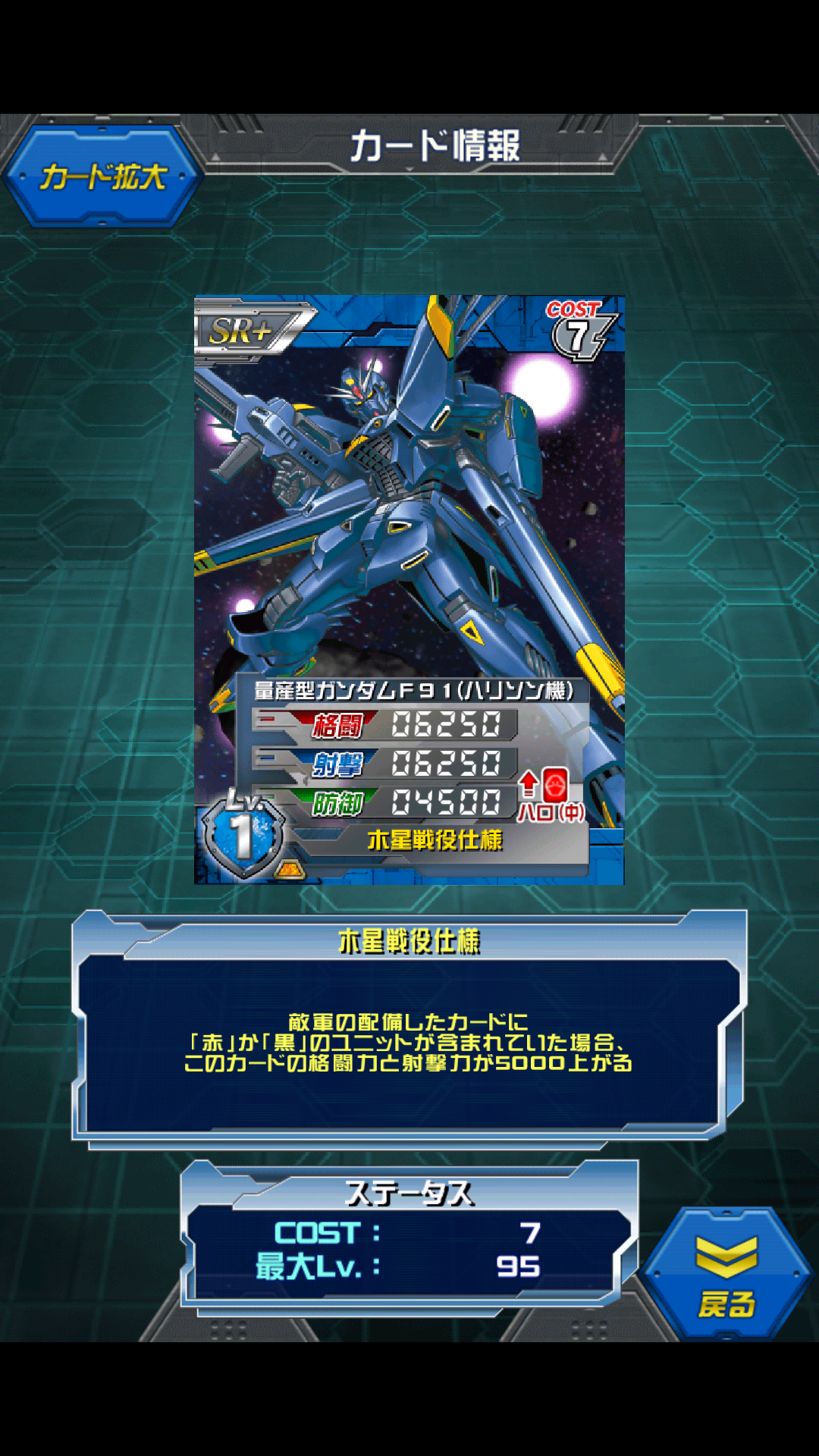 量産型ガンダムF91(ハリソン機) クロスボーンイベント 碧い惑星に沈む ガシャ景品 このイベントで唯一青ハロを使うユニットカード 開発あると思ったのに… MAX値は9000/9000/6500 敵に赤か青がいれば14000/14000/6500 スキル発動後の数値だけ見れば コスト7としてはそこそこ上出来…ですが 白のルージュを見てからだと明らかな下位互換。 まぁレアリティの差もあるので仕方ないですが… マルチカラーが多くなってくるとこういった敵軍色スキルは 発動しやすくなりそうですね。 今後URにもこういったスキルカードは増える…かもしれません。 連邦の青い閃光の二つ名を持つハリソン専用機。 青色は彼のパーソナルカラーとして使用されている。 キンケドゥに初めてクロスボーンのシールドを使わせた機体(男) 木星戦役ではハリソンが搭乗し 鋼鉄の7人ではミノルに貸したりしている。 この機体を見てキンケドゥは「懐かしい」との感想。 ヴェスバーはこの時代でも最強のビーム兵器の様子。 [2回]