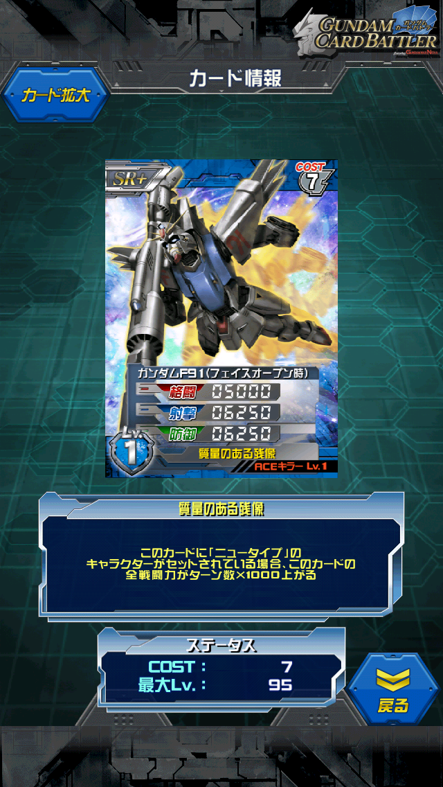 ガンダムF91(フェイスオープン時) 敗北スキルから一転使いやすくなったF91 MAX値は7000/9000/9000 3ターン目なら10000/12000/12000とアベレージユニットにしては結構使える ・・・のだが問題なのが専用パイロットのシーブック コスト5 ALL2000でニュータイプLv1というコスパの悪さ ステータス自体は機体とマッチしているだけに悲しい スキル自体はニュータイプセットで発動するので いっその事低コストのニュータイプを乗せて事故防止に使うとか [0回]PR