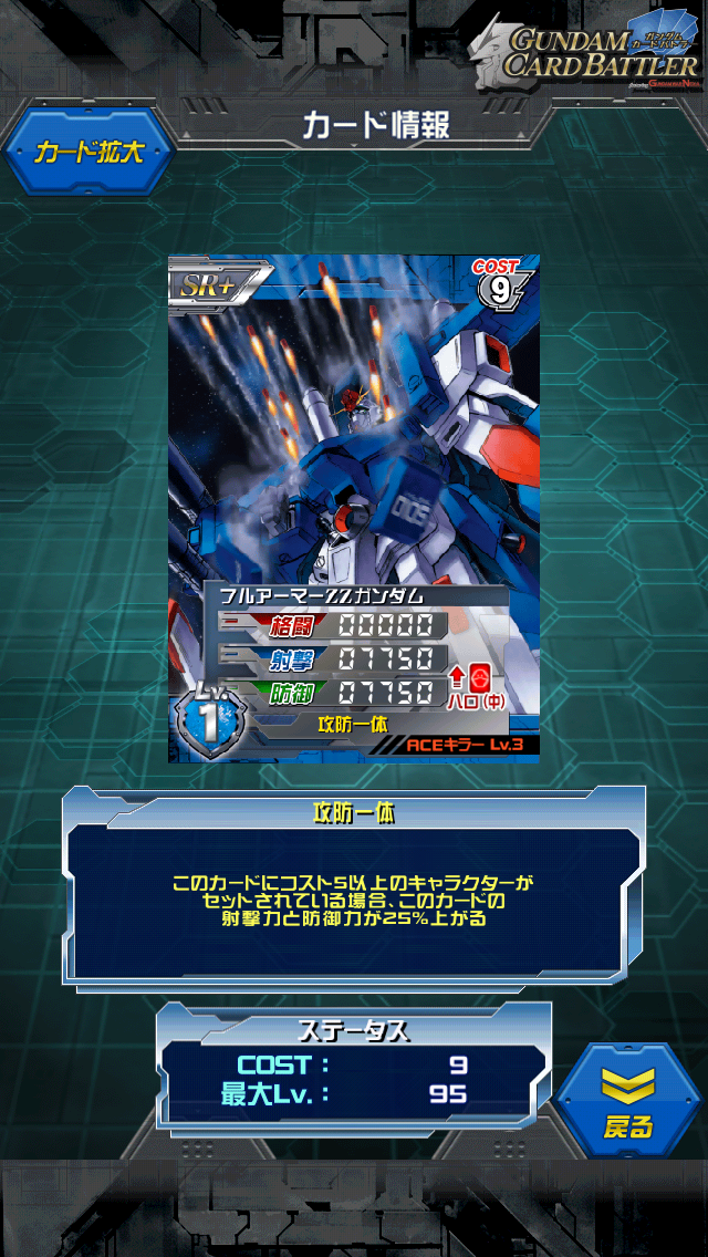 フルアーマーZZガンダム ZZガンダム+フルアーマーガンダムMk-2の開発ユニット フルアーマーガンダムMk-2が拾えるかが鍵 MAX値は0/11000/11000 専用キャラをセットすれば0/13750/13750 スキル効果もGNアームズ TYPE-Eと一緒 専用パイロットはZZ同様にジュドー、ルー、エル等々豊富 この手のステータス持ちは青に多いですが 防御も上がるところはさすがコスト9といったところか パフェジュドーの性能が高いので是非ともセットで使いたいところ ただまぁユニット/キャラ両方重いことに違いはないので デッキと相談しながら組み込んでください 最終決戦で登場したZZのフルアーマー化 強化装甲にミサイル、胸のハイメガとかなりの防御力、攻撃力を持つ機体 ジュドーはこの機体を見た瞬間「こんなの重すぎるよ!」と言ったら アストナージから「使い終わったら捨てればいいんだ!」 うん、パージする瞬間こそ至高 地味に内部のZZガンダムも強化型ZZガンダムだったりします。 ちなみによく間違えられるのですが FAZZはフルアーマーZZの略ではありません。 FAZZはファッツというZZの派生機体なので別物です。 拾いものですがこちらがファッツです [1回]