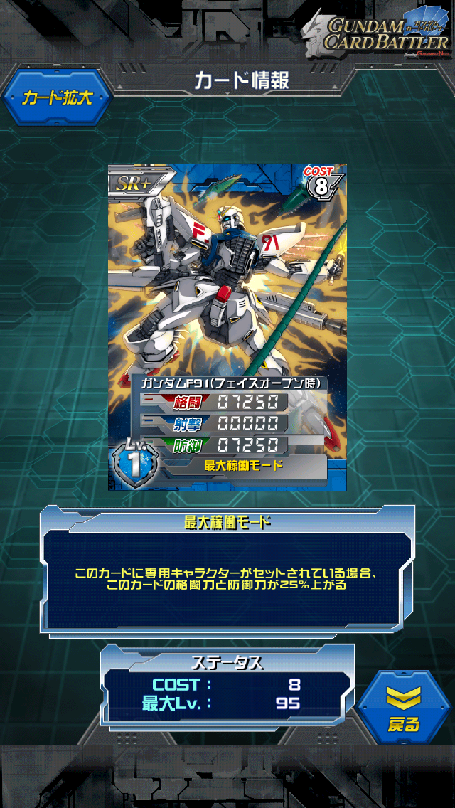 ガンダムF91(フェイスオープン時) 第1回ランキングバトル 1000P景品です ヴェスバーなんか捨て去ったF91のカードです。 MAX値は10500/0/10500 スキル発動で13125/0/13125と青に数少ない格闘の救世主 F91と言えば腰のビームシールドを突き破るほどの威力を持ったヴェスバーなのですが 全く考慮しておらず射撃は0です。 格闘射撃でリガズィカスタムの後釜を期待したのですが…残念 1ターン目から発揮できる点とパイロットにSRがいることから ネオガンダム1号機の上位互換と言っても過言ではないかと 青単を作っている人は勲章を付けても全く問題ないと思います。 一応明日明後日にはシーブックを取るつもりですが キンケドゥでもいいんじゃないだろうか?と思う自分もいます スキルで表されている最大稼働モードを行った時は 排熱処理のため口が開き、肩の放熱フィンが広がり、さらに機体の表面の金属が剥離して レーダーにはまるで分身を行っているかのように見えるM.E.P.E現象が発生します。 これによりカロッゾは金属剥離した幻に対して「質量のある残像」に見えたということです。 ちなみに「ガンダム」の名称が付いていますが 艦長がその姿を見てガンダムに似ていることから名づけられただけなので 実際はガンダムF91という名称では無かったのかもしれません。 F99 レコードブレイカー F97 フリント というクロスボーンで与えられている名称を考えると F91開発企業のサナリィはガンダムではなく別の名前を付ける予定だったのかもしれませんね [0回]