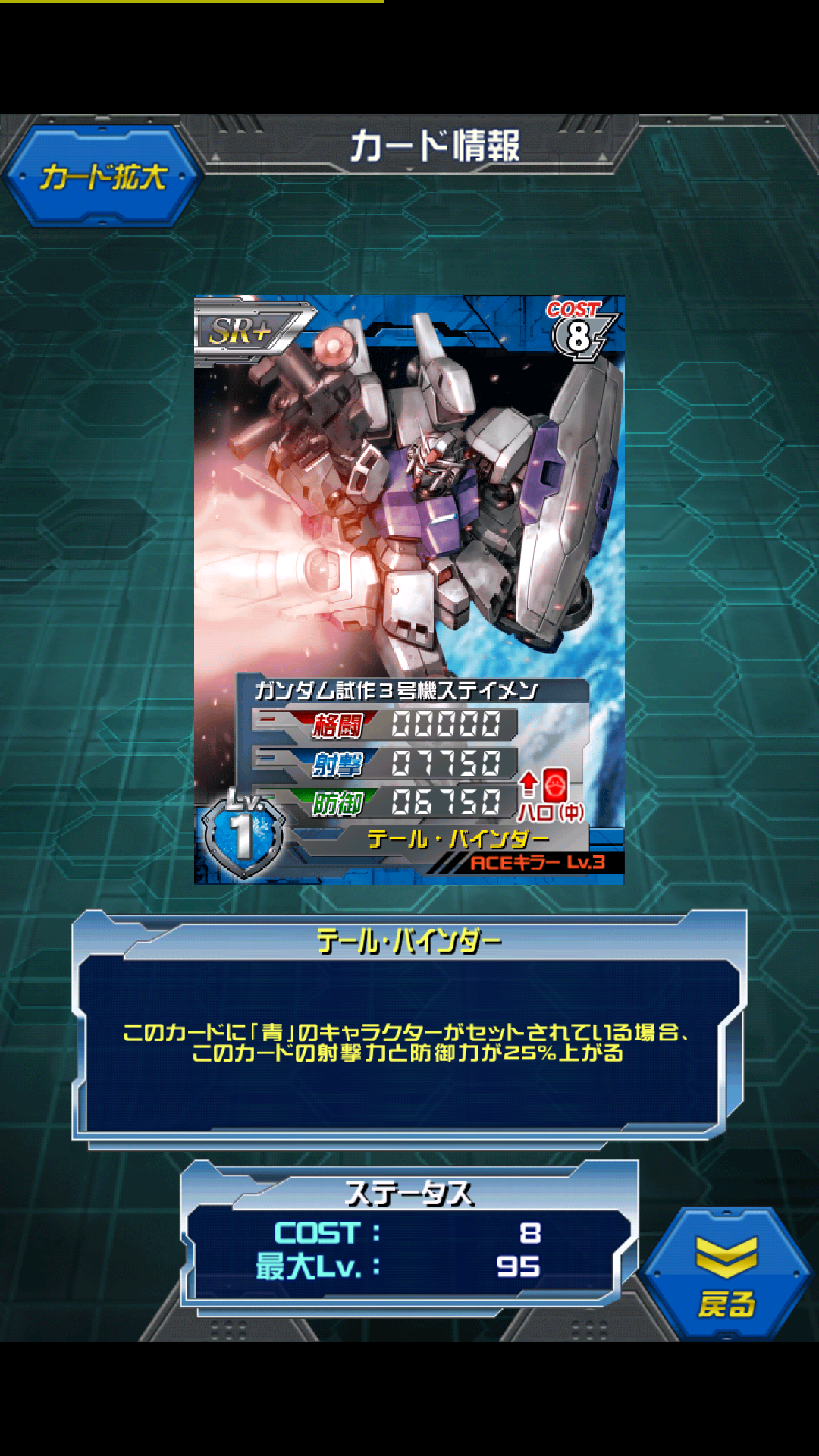 ガンダム試作3号機ステイメン 0083 アナハイムロゴガシャ景品 3号機の本体でもあるステイメンです MAX値は0/11000/9500 青キャラセットで0/13750/9500 極端な事を言うとFA-ZZのコストを下げて防御を落としたバージョン FA-ZZとの差は防御値 デルタよりも防御が低いのでオート基本の人は 変に防御が高くないこちらのほうが使いやすいかも 3号機と言えばオーキスを装備したデンドロビウムを想像しますが そのコアであるステイメンも地味に高スペックな機体です 「ステイメン」はおしべの意味 「デンドロビウム」は野生のランを意味している アナハイムの開発者が女性なので花の名前が付けられているのかもしれませんね [0回]