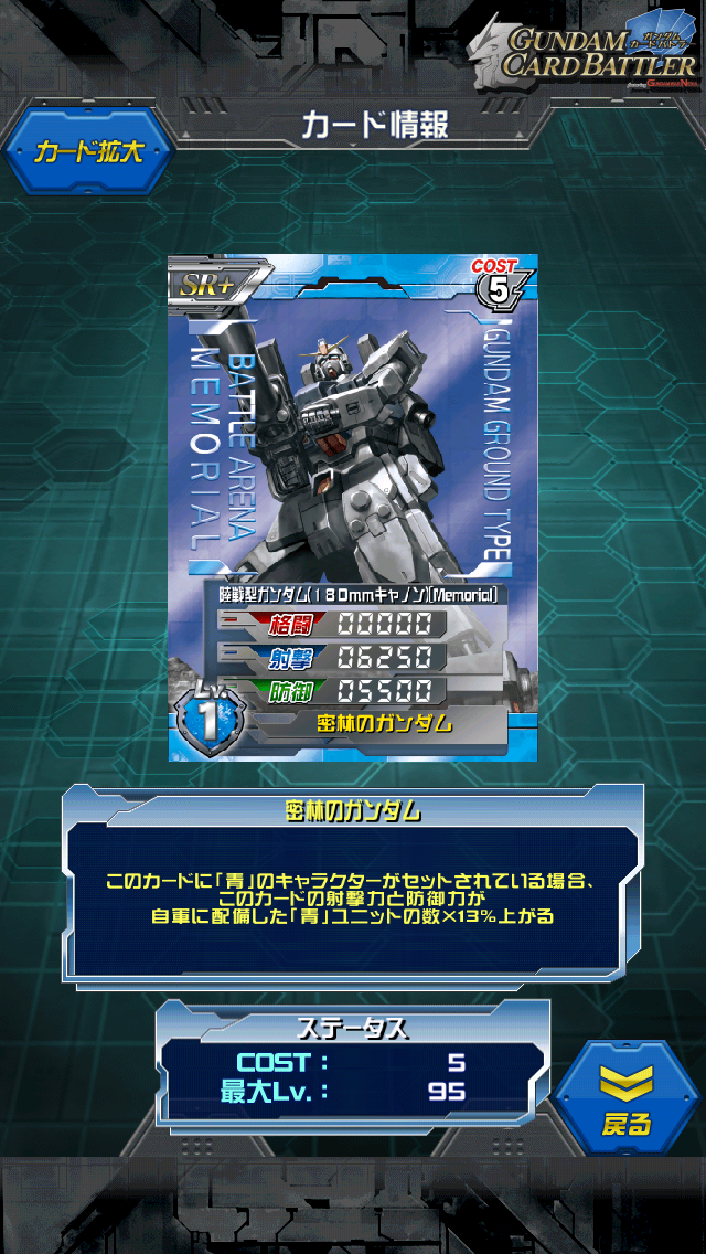 陸戦型ガンダム(180mmキャノン)[Memorial] 第2回バトルアリーナ 1000P交換景品 なにがメモリアルなのか分かりませんがメモリアルカードです。 MAX値は0/9000/8000 自軍の青の数×13%射撃と防御が上昇するという何とも計算しづらいスキル 全て青なら39%上昇するので0/12510/11120、かな 青単という縛りはあるもののコスパとしては上出来 コスト6ぐらいのステータスにはなります。 ただ青には射撃防御が溢れているので出番があるのかは微妙なところ これがリガズィカスタムの後に続く格闘射撃だったなら...惜しい 08MS小隊に登場した陸戦型ガンダム ガンダムの粗悪余剰パーツを使って作られた、いわゆるガンダムの出来損ない 08小隊には3機が配備される...1小隊に渡しすぎでは... もちろん宇宙に出ることなど想定していない、のだが どこかのスパロボではちょっと改修しただけで平気で宇宙に出撃する。 それを見たコウが 「なんで陸ガンが出れて僕の1号機は出れないんだ」 と怒るのも無理はないかと [0回]PR