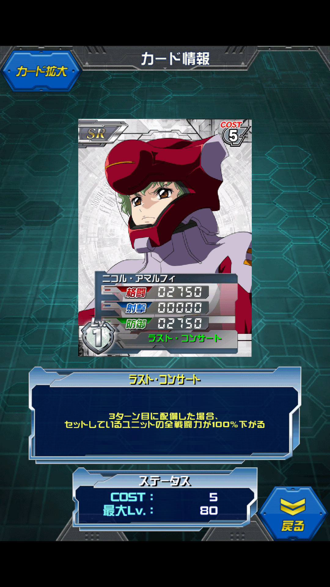 ニコル・アマルフィ 2014年末SEED中隊戦イベント ガシャ景品 ブリッツガンダムのパイロットです。 MAX値は5000/0/5000 3ターン目は機体の100%ダウン…です… ラストコンサートて・・・ ブリッツのステータスにマッチしているのだが 1,2ターン目に引けないリスクが怖い。 パイロットの100%ダウンではなく ユニットの100%ダウンなのでほぼステータスは0になる。 ステータス自体は5000でそこまで高いわけでも無く ブリッツ自体パイロット問わないので あまりニコルを乗せる理由は無いかも… ザフトのクルーゼ隊の1人 ディアッカ、イザークといった戦闘狂(?)ではなく 戦うことはそこまで好きでは無かったためアスランの話相手になっていた。 奪われたGの中で唯一撃墜されたのが彼。 アスランを庇ってソードストライクの餌食になり物語の半分近くで退場するのだが やたらとその場面の回想シーンだけは多い。 あまり格闘も防御も印象に無いんですけどねぇ… [0回]PR