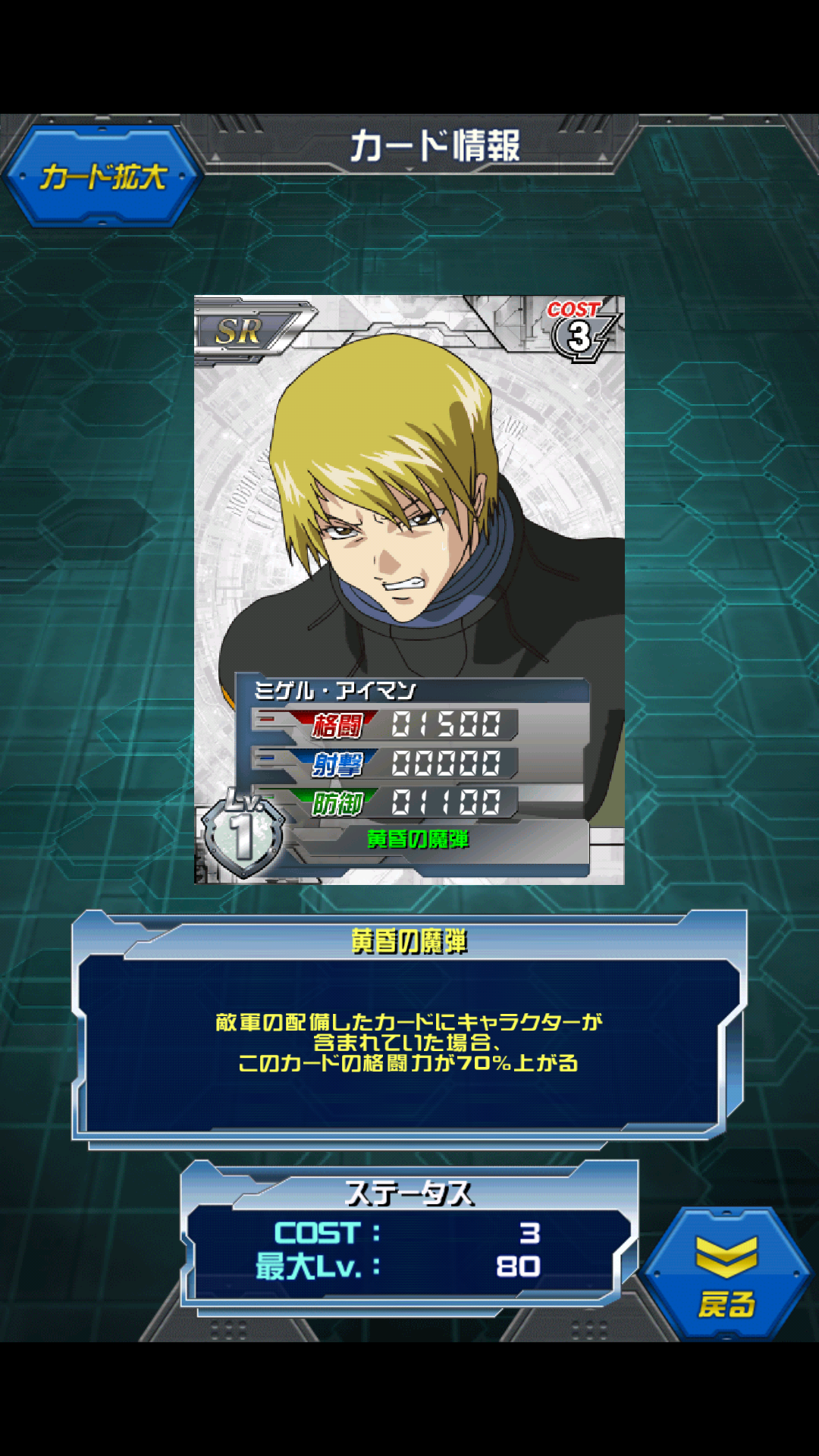 ミゲル・アイマン 2014年末SEED中隊戦イベントポイントガシャ景品 起動したガンダムにやられるSEED版ジーンです。 MAX値は2750/0/2000 敵キャラがいれば4675/0/2000の格闘キャラ 珍しいコスト3のSR スキルも特にユニットを指定するものではないので コストが中途半端に余った際に役立つカード。 格闘しか出来ないのですがそこはコスト3、ご愛嬌です。 色も問わないので意外と役に立つ…かもしれません。 第1話でストライクの性能を見せつけられ 第2話でソードストライクに真っ二つにされて出番のなくなった雑魚パイロット …かと思いきや「黄昏の魔弾」とか二つ名があるエースパイロットだったりする。 声優はホワイトブレスのあの人。 [2回]