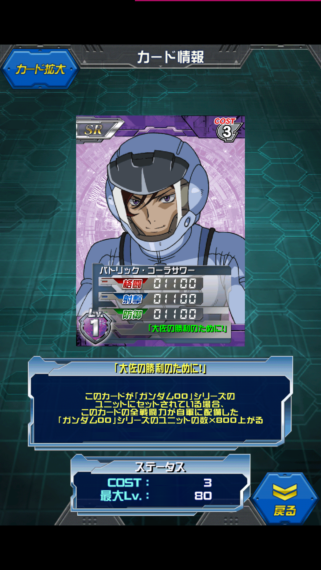 パトリック・コーラサワー 仮面イベントver2の赤コンテナ景品 エース、らしいのだがギャグキャラ気味なので凄さが分からない MAX値は2000/2000/2000 長文スキルだが00単ならスキル発動で4400/4400/4400になる コスト3という痒いところに手が届くコストが魅力 イオリアでいいじゃん、というのは言わないお約束 専用機も色々あるのだが機体自体に魅力が無いので コスト3の穴埋めパイロットと見れば使う場面は多いかも ガンダムと戦いつつも生き残る 付いた二つ名は不死身のコーラサワー 決して逃げている訳では無く絶えず前線に出てガンダムと戦っているのだが やられ方がバイキンマンやロケット団等を思い出させる 劇場版でグラハム、小熊と倒れていった中でも なんだかんだで生還する凄い奴 [2回]PR