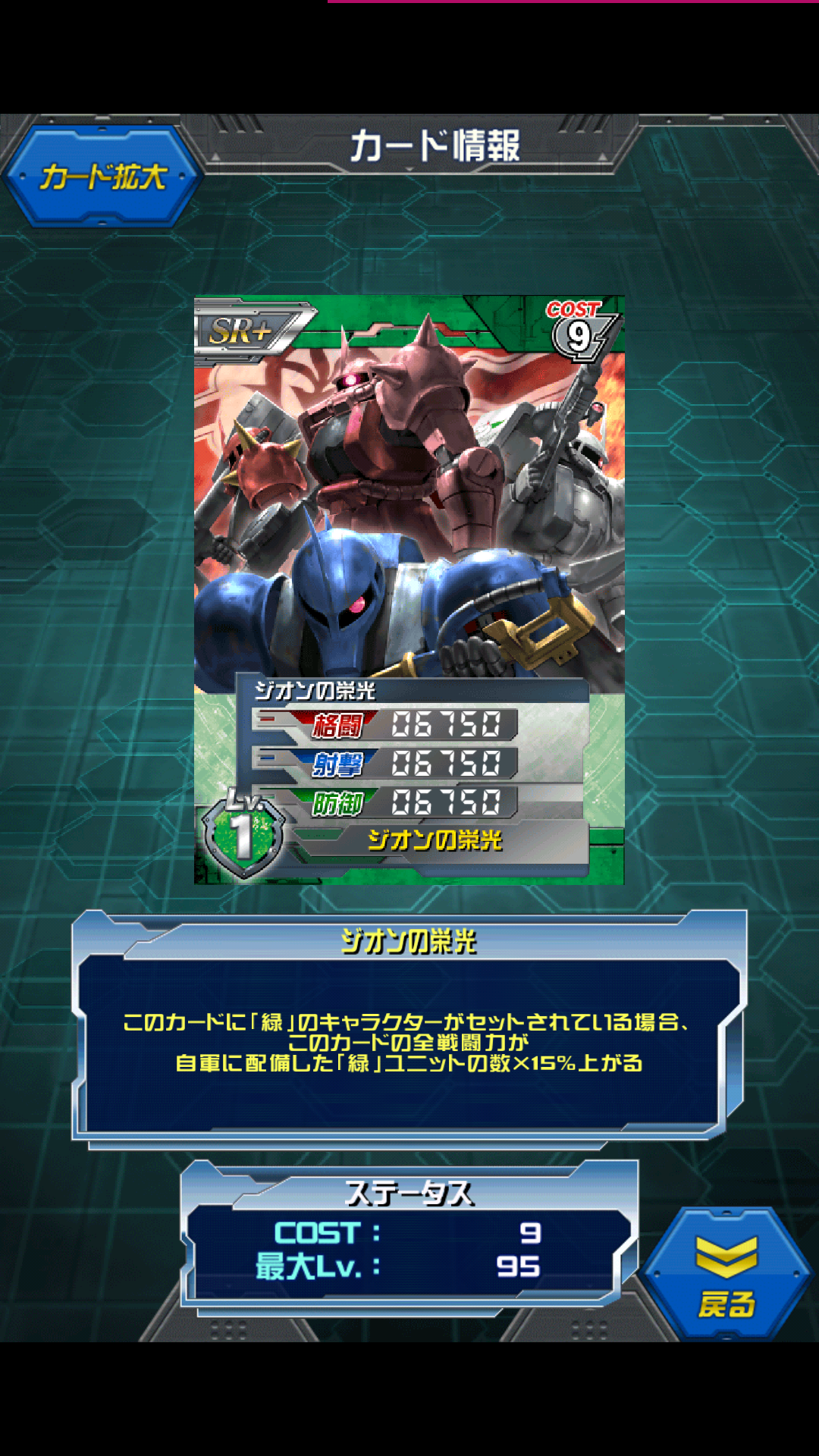 ジオンの栄光 戦場の荒野 ランキング報酬 ★無しの生ステータスです。 MAX値は9500/9500/9500 緑キャラセットで場の緑の数分ステータスが上がり 最大ALL13775です。 よく調べていませんがイラストからすると適正があるのは シャア、ジョニー、マツナガ、ラルかと 緑キャラなら何でもいいのでギレンやデギン等 コスト1パイロットでも構わないところが利点 とは言えコスト9というのはかなり重いし コスト9のド平均にはパーフェクトジオングがいるので あくまでもパオングが手に入らない方のための代打カードかと ジオンの栄光、、、1年戦争の間だけの輝きでしたね 1年戦争の後も一応ジオンの血は微妙に残っており 0083のデラーズフリートはもちろん ZのリックディアスにはジオンMSの開発者が関わっているとか F90では火星にジオン軍を作ったりしています [1回]PR